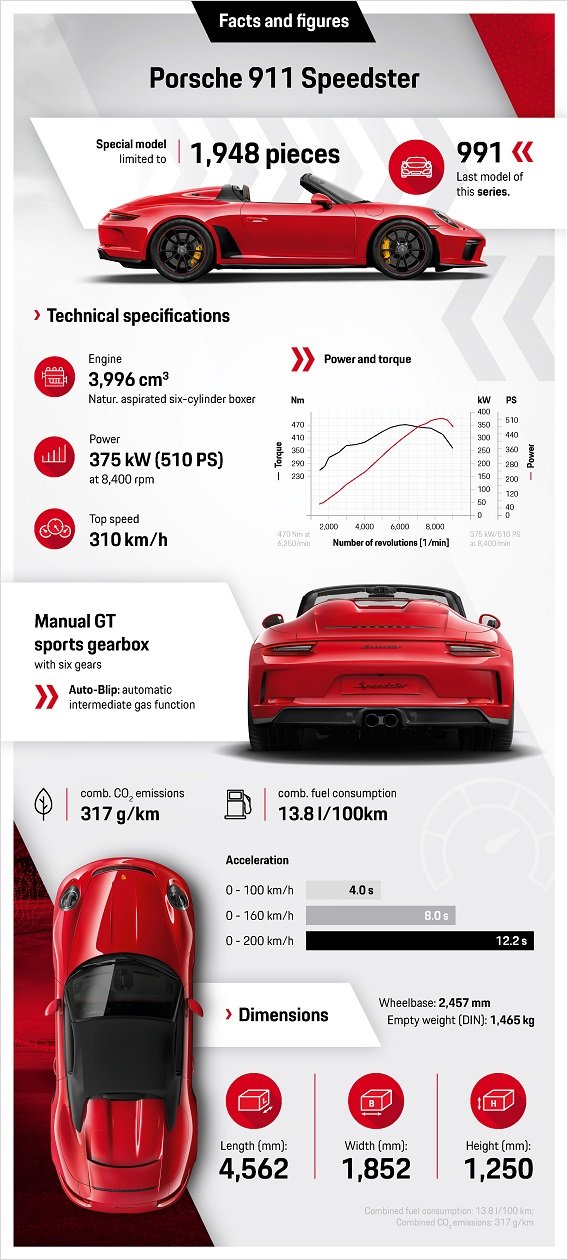 911 Speedster ถูกนำเสนอมาก่อนด้วยรถต้นแบบ ถูกพัฒนาขึ้นบนพื้นฐานของ 911 โมเดล 991.2 ซึ่งถ้าเทียบกัน ตัวต้นแบบจะผิดเพี้ยนไปจากเวอร์ชั่นพร้อมจำหน่ายจริงไม่มากนัก Porsche สร้างความน่าสนใจด้วย คำว่า Limited Edition เพราะ 911 Speedster จะพร้อมลงไลน์การผลิตจากโรงงานในเมือง Zuffenhausen ช่วงกลางปี 2019 ด้วยจำนวนการผลิตเพียง 1,948 คัน เพื่อระลึกถึงตำนาน Porsche 356 รถในรูปแบบโรดสเตอร์คันแรก ที่ถูกผลิตขึ้นในปี 1948