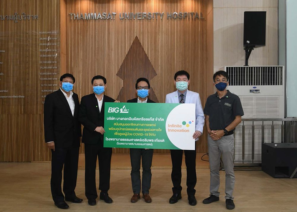 นายปิยบุตร จารุเพ็ญ กรรมการผู้จัดการ บริษัทบางกอกอินดัสเทรียลแก๊ส หรือ บีไอจี ผู้นำนวัตกรรมก๊าซอุตสาหกรรมครบวงจรของประเทศไทย เปิดเผยว่า ในวันที่ 1 เมษายน 2563 บริษัทฯ ได้สนับสนุนอุปกรณ์ทางการแพทย์ โดยมอบออกซิเจนทางการแพทย์ อุปกรณ์ลดแรงดัน และชุดช่วยหายใจ โดยมี รศ.นพ.พฤหัส ต่ออุดม ผู้อำนวยการโรงพยาบาลธรรมศาสตร์เฉลิมพระเกียรติ และ ผศ.ดร.ปริญญา เทวานฤมิตรกุล รองอธิการบดีฝ่ายบริหารและความยั่งยืน มหาวิทยาลัยธรรมศาสตร์ ให้เกียรติรับมอบ ณ ห้องโถง อาคาร ม.ร.ว.สุวพรรณ สนิทวงศ์ โรงพยาบาลธรรมศาสตร์เฉลิมพระเกียรติ ศูนย์รังสิต เพื่อใช้ในการรักษาผู้ป่วยโรคติดเชื้อไวรัสโคโรนา 2019 ซึ่งอุปกรณ์เหล่านี้ มีความสำคัญในกระบวนการรักษาทางการแพทย์ เนื่องจากออกซิเจนมีส่วนสำคัญช่วยในการฟื้นฟู และคืนสภาพระบบทางเดินหายใจกลับมาสู่ภาวะปกติ ในกรณีที่ผู้ป่วยมีการติดเชื้อทางปอด โดยออกซิเจนถือเป็นหนึ่งในผลิตภัณฑ์ที่สำคัญของบริษัทฯ ที่ได้จากกระบวนการแยกอากาศด้วยเทคโนโลยีขั้นสูง มีคุณสมบัติสะอาดและมีความบริสุทธิ์ จึงถูกนำไปใช้ในวงการแพทย์ได้อย่างปลอดภัย ทำให้บริษัทฯ เป็นผู้นำในการผลิตและบริการออกซิเจนทางการแพทย์สำหรับโรงพยาบาลในประเทศไทยตลอดมา