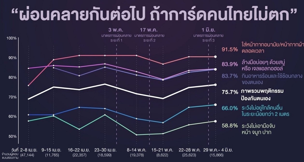 โดยมีจำนวนผู้ตอแบบสอบถาม 15,866 รายพบว่า ประชาชนมีภาพรวมพฤติกรรมป้องกันตนเองอยู่ที่ 75.7% โดยหากแยกตามรายมาตรการพบว่าการใส่หน้ากากอนามัย/หน้ากากผ้าตลอดเวลาเป็นพฤติกรรมที่ประชาชนปฏิบัติมากที่สุดถึง 91.5% รองลงมา ได้แก่ ล้างมือบ่อยๆ ด้วยสบู่ หรือ เจลแอลกอฮอล์ 83.9% กินอาหารร้อนและใช้ช้อนกลางของตนเอง 83.7% ระวังไม่อยู่ใกล้คนอื่น ในระยะน้อยกว่า 2 เมตร 66% และระวังไม่เอามือจับหน้า จมูก ปาก 58.8% ซึ่งเมื่อเปรียบเทียบพฤติกรรมป้องกันตนเองที่ปฏิบัติอยู่ในปัจจุบัน กับเดือน เม.ย. ที่ผ่านมา พบว่าประชาชนส่วนใหญ่ 69.6% ปฏิบัติเหมือนเดิม และมีอีก 16% ที่ปฏิบัติมากขึ้น