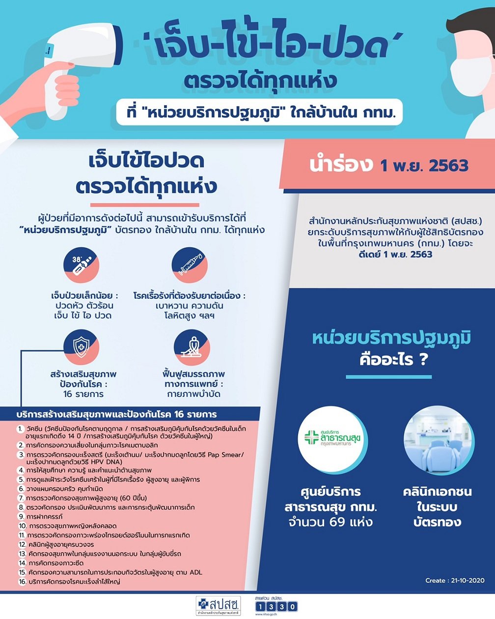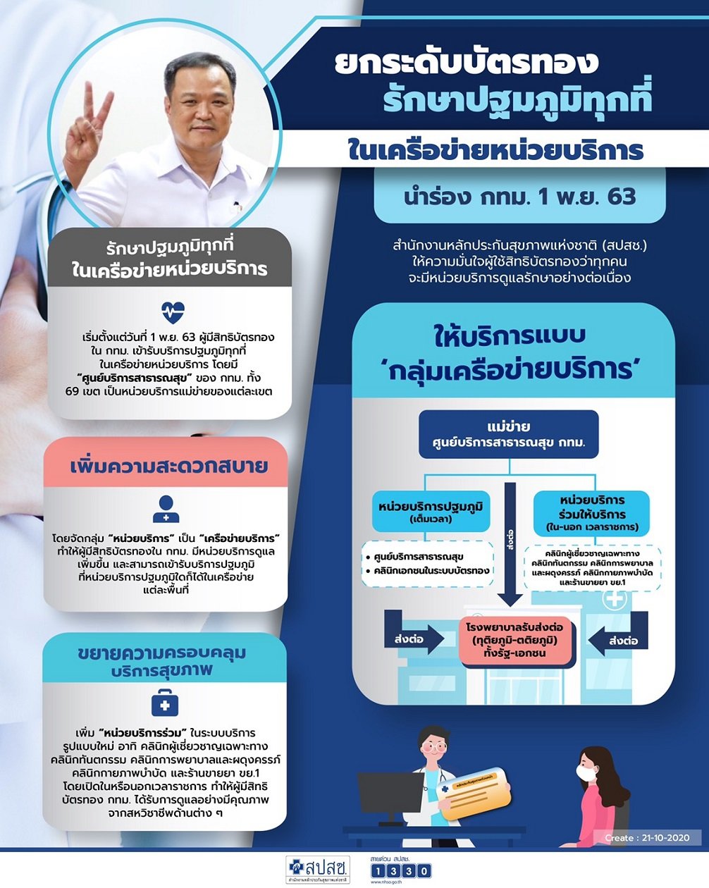 สปสช.ร่วมมือ กทม. ปฏิรูประบบบริการสุขภาพปฐมภูมิใน กทม. ดีเดย์ 1 พ.ย. 2563 นี้ ประชาชนไปรับบริการใกล้บ้านที่ไหนก็ได้ในเครือข่ายนั้น ทั้งคลินิกเต็มเวลาและคลินิกเฉพาะทางนอกเวลาที่เข้าร่วมระบบบัตรทอง ส่วนผู้ได้รับผลกระทบถูกยกเลิกหน่วยบริการประจำกว่า 2 ล้านคนไม่ต้องวิ่งไปลงทะเบียนที่ไหน สปสช.จัดหน่วยบริการประจำใหม่ให้ใกล้คลินิกเดิมที่สุด พร้อมเปิดให้เปลี่ยนหน่วยบริการประจำได้ในภายหลังหากไม่พอใจ