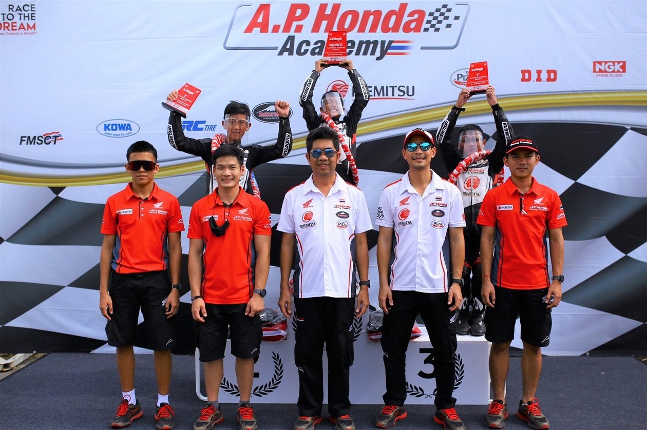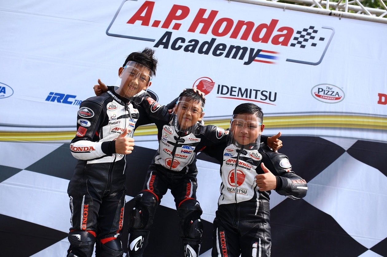 บันไดขั้นแรกสู่การแข่งขันระดับโลก รายการ เอ.พี. ฮอนด้า อะคาเดมี่ ภายใต้โครงการ “ฮอนด้า เรซ ทู เดอะ ดรีม” เปิดศึกดวลความเร็ว สนามที่ 5 ของฤดูกาล 2020 ที่สนามไทยแลนด์ เซอร์กิต นครชัยศรี เมื่อวันที่ 29-30 ตุลาคม ที่ผ่านมา ชิงชัยจำนวน 2 เรซ เรซแรกผลปรากฏว่า ผู้ชนะเป็นของ “น้องออสติน” ธนฉรรต ประทุมทอง หมายเลย 8 ตามด้วยอันดับที่ 2 “น้องจิมมี่” บูรพา วันมูล หมายเลย 12 และอันดับที่ 3 เป็นของ “น้องกัน” พชรกร ทองเกิดหลวง หมายเลข 4 ส่วนเรซที่สอง “น้องกัน” สลับขึ้นมาคว้าแชมป์ ตามด้วย “น้องจิมมี่” เข้าที่ 2 และ “น้องออสติน” ยังได้ยืนโพเดียมในอันดับที่ 3