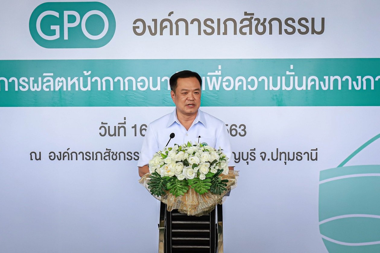 นายอนุทิน กล่าวว่า สถานการณ์โรคโควิด 19 ทั่วโลกยังคงมีการแพร่ระบาดอย่างต่อเนื่อง ทำให้ความต้องการใช้หน้ากากอนามัยสูงขึ้นกว่าเดิมถึง 5 เท่าหรือประมาณ 200 ล้านชิ้นต่อเดือน จากภาวะปกติอยู่ที่ 30 - 40 ล้านชิ้นต่อเดือน และที่ผ่านมามีการขาดแคลนหน้ากากอนามัยและหาซื้อได้ยาก จึงให้องค์การเภสัชกรรมดำเนินการผลิตหน้ากากอนามัยทางการแพทย์ที่มีคุณภาพ ตามมาตรฐานผลิตภัณฑ์อุตสาหกรรม (มอก.) หน้ากากใช้ครั้งเดียว ซึ่งอ้างอิงตามมาตรฐานASTM F2100-11 ของประเทศอเมริกา เพื่อให้บุคลากรทางการแพทย์ได้มีหน้ากากอนามัยที่มีคุณภาพใช้อย่างเพียงพอ โดยกระจายให้กับโรงพยาบาลภาครัฐ และบางส่วนจำหน่ายให้แก่ประชาชนผ่านร้านขายยาทั้ง 8 สาขา และร้านค้าออนไลน์ขององค์การเภสัชกรรม เพื่อให้คนไทยได้ใช้หน้ากากอนามัยที่มีคุณภาพมาตรฐาน เนื่องจากการสวมหน้ากากอนามัยจะช่วยป้องกันการรับและแพร่กระจายเชื้อ พิสูจน์ได้ว่าการสวมหน้ากากเป็นวิธีที่ดีที่สุดในการป้องกันโรคโควิด 19 และโรคระบบทางเดินหายใจอีกหลายโรค จนทำให้ไทยสามารถควบคุมสถานการณ์โรคโควิด 19 อยู่ในระดับต่ำ จนเป็นที่ยอมรับขององค์การอนามัยโลก ซึ่งมาจากความร่วมมือของประชาชน รวมทั้งหน่วยงานภาครัฐและเอกชน