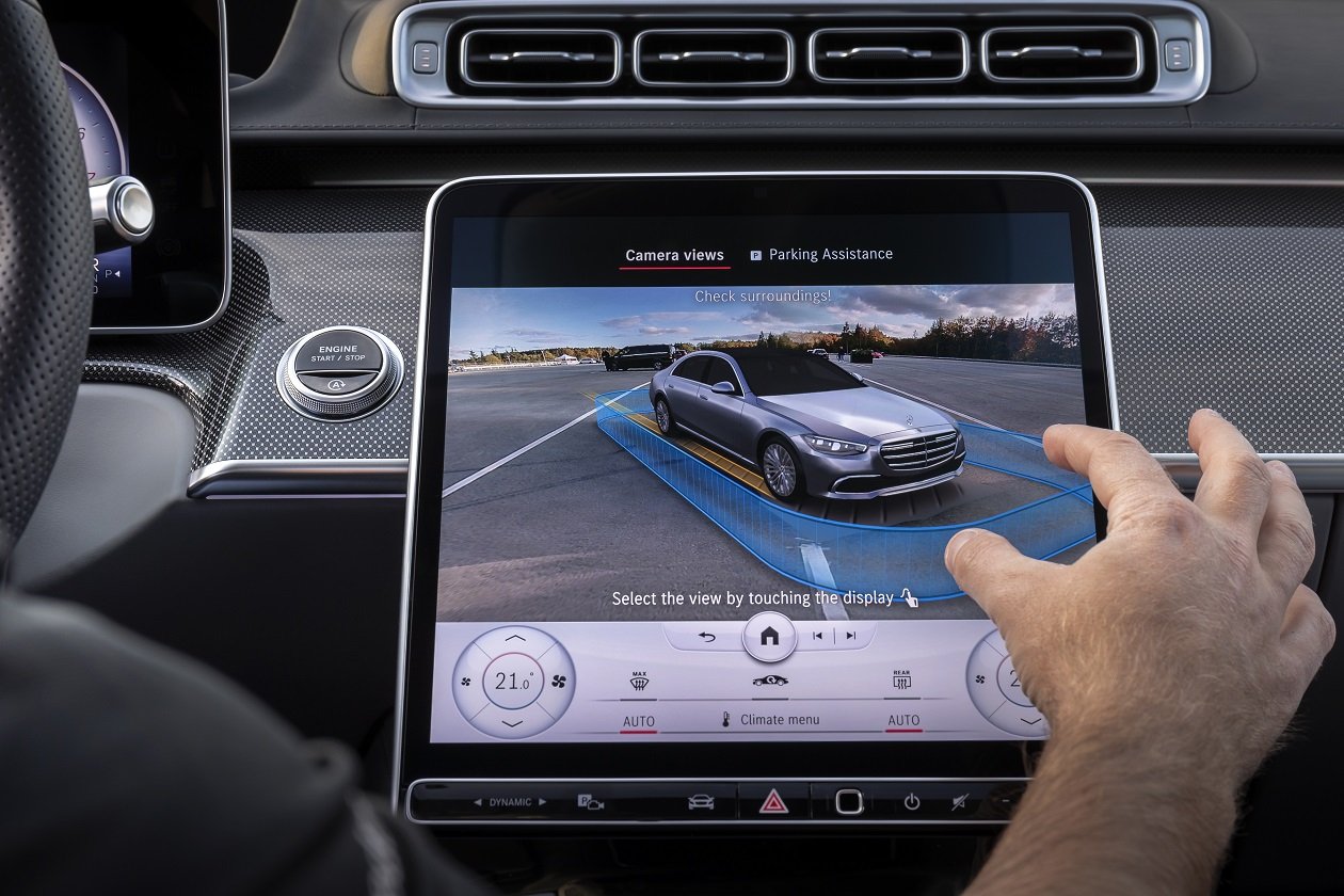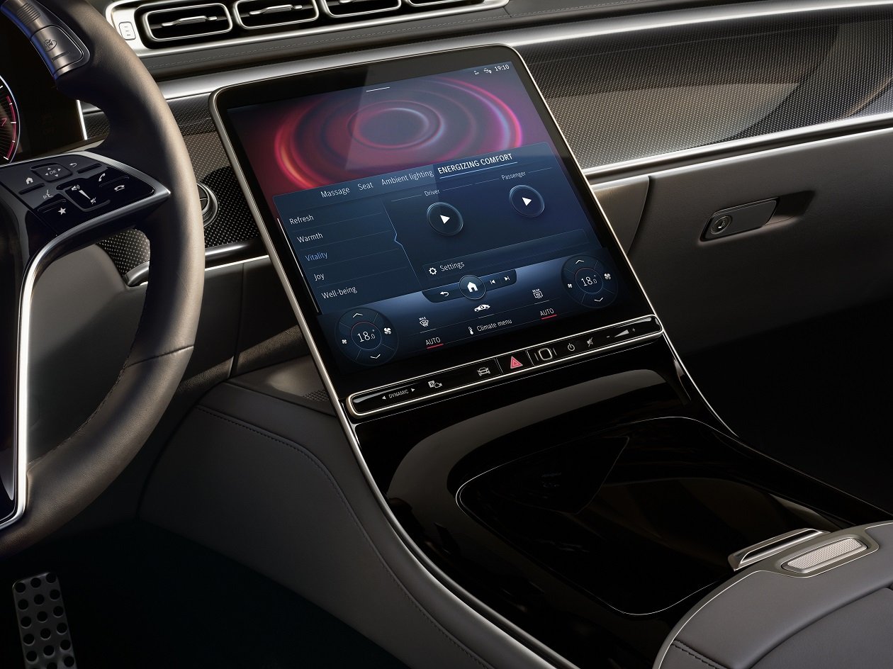 นอกจากนี้ The new S-Class ยังนำทุกปุ่มควบคุมตรงคอนโซลส่วนกลางให้เข้ามาอยู่บนหน้าจอ MBUX7 แบบทัชสกรีนขนาด 12.8 นิ้วทั้งหมด โดยใช้หน้าจอแบบ OLED ที่มอบพื้นที่การใช้งาน (active area) บนหน้าจอที่เพิ่มขึ้นจากรุ่นเดิมกว่า 64% ภายใต้การออกแบบในลักษณะฟรีฟอร์มดูบางเบาทว่าตอบสนองฉับไว ช่วยให้ผู้ขับขี่สามารถควบคุมทุกฟังก์ชันการทำงานของรถยนต์และฟังก์ชันต่าง ๆ ภายในห้องโดยสารได้อย่างใจเพียงปลายนิ้วสัมผัส โดยผสานการทำงานร่วมกับระบบเซ็นเซอร์ลายนิ้วมือที่จะเก็บข้อมูลส่วนบุคคลของผู้ขับขี่แต่ละคนเพื่อตอบสนองความต้องการเฉพาะบุคคลตลอดการขับขี่ได้อย่างตรงใจ