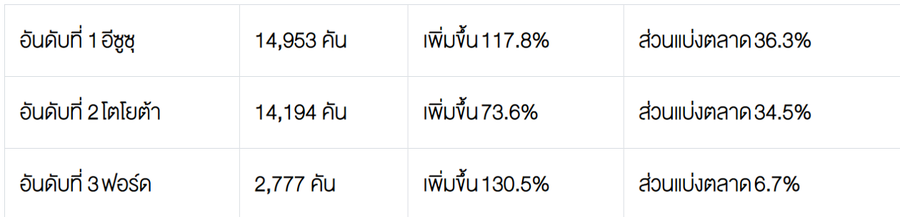 *ปริมาณการขายรถกระบะดัดแปลง (ในตลาดรถกระบะขนาด 1 ตัน) 20,091 คัน โตโยต้า 8,517 คัน - อีซูซุ 7,107 คัน - มิตซูบิชิ 2,628 คัน – ฟอร์ด 1,755 คัน – นิสสัน 84 คัน