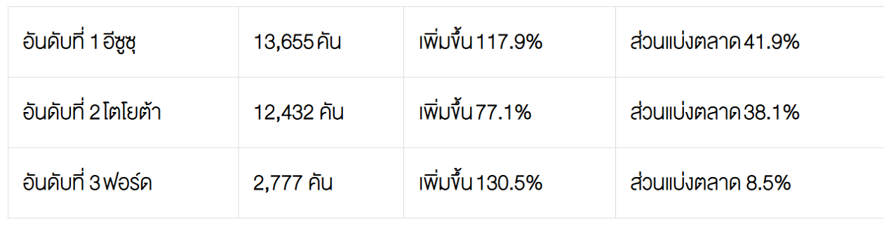*ปริมาณการขายรถกระบะดัดแปลง (ในตลาดรถกระบะขนาด 1 ตัน) 5,147 คัน โตโยต้า 2,015 คัน - อีซูซุ 1,930 คัน – มิตซูบิชิ 661 คัน – ฟอร์ด 506 คัน – นิสสัน 35 คัน