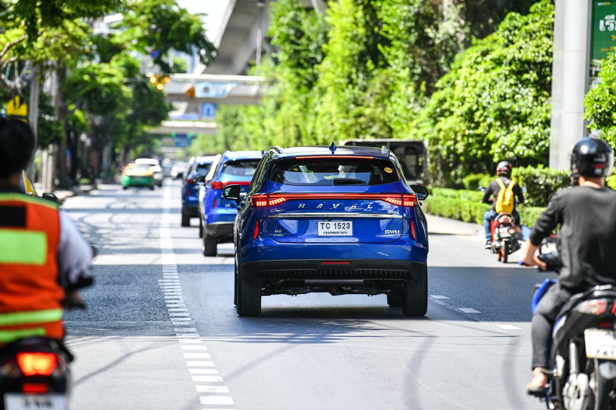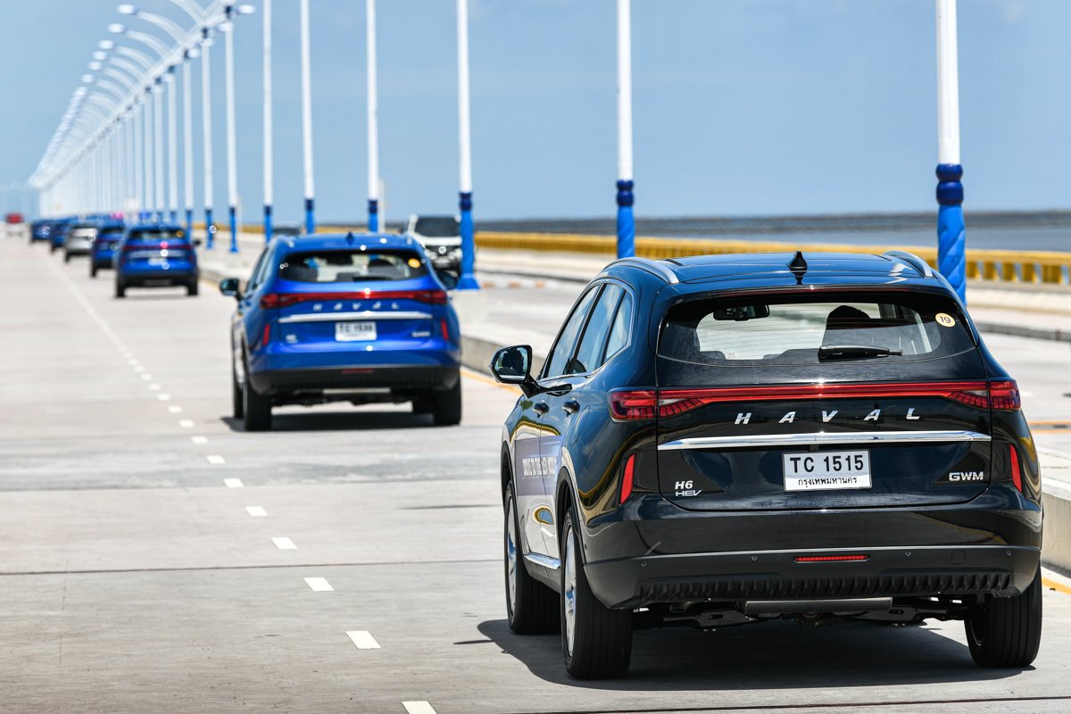 จากนั้นออกจากถนนสุขุมวิท ก่อนที่จะเลี้ยวซ้ายเข้าสู่ถนนบางนา-ตราด และขึ้นไปวิ่งบนเส้นบรูพาวิถี บนถนนเส้นนี้สามารถทำความเร็วได้ในระดับนึง ซึ่งทีมงานขับอยู่ที่ประมาณ 100-120 กิโลเมตร ช่วงล่างตอบสนองได้ดีเกาะถนน นิ่มนุ่มนวลแต่ไม่ย้วย และถนนเส้นนี้ถ้าขึ้นไปวิ่งด้านบน จะสามารถทำให้รู้ถึงแรงลมที่มาปะทะข้างรถได้อย่างชัดเจนเจ้า All New HAVAL H6 Hybrid SUV ถือว่าเซ็ทช่วงล่างมาได้ดี ไม่มีอาการซ่ายไปมาเมื่อเจอกับลมแรงๆ บนถนนเส้นนี้ วิ่งจนสุดถนนก่อนที่จะเลี้ยวขวาเข้าไปวิ่งถนนเลียบชายหาดบนสะพานชลมารควิถี 84 พรรษา ก่อนนะเลี้ยวซ้ายเข้าสู่ถนนข้าวหลามมุ่งหน้าสู่สนามบินหนองค้อ จ.ชลบุรี เพื่อที่จะทดสอบสมรรถนะแบบอื่นกันต่อไป