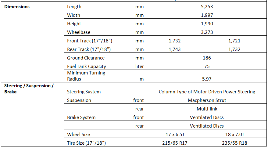 การออกแบบด้วยการใช้นวัตกรรมการใช้พื้นที่ภายในห้องโดยสารอย่างชาญฉลาดเกิดขึ้นจากการใช้ฐานล้อที่มีขนาดยาวที่สุดของรถยนต์อเนกประสงค์ขนาด 3,273 มม มิติขนาดตัวถัง ยาว 5,253 มม กว้าง 1,997 มม สูง 1,990 มม. ช่วยเพิ่มความสะดวกสบายเมื่อต้องเข้าและออกจากรถ