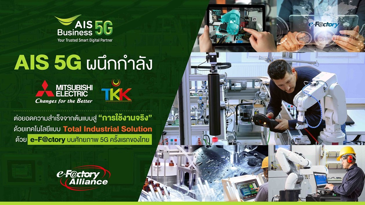 ด้าน นายธนพงษ์ อิทธิสกุลชัย หัวหน้าคณะผู้บริหารกลุ่มลูกค้าองค์กร AIS กล่าวว่า “หัวใจสำคัญของการขยายศักยภาพ 5G สู่ภาคอุตสาหกรรมนอกเหนือจากความแข็งแกร่งของการมีเครือข่ายที่พร้อมใช้งานแล้ว การมีพันธมิตรทางธุรกิจที่พร้อมเดินหน้าพลิกโฉมการเปลี่ยนแปลงของโรงงานให้มีศักยภาพสอดรับกับโลกยุคใหม่ก็เป็นแนวทางสำคัญที่ AIS ยึดถือมาโดยตลอด โดยในครั้งนี้นับเป็นอีกก้าวสำคัญที่เราจะยกเอาต้นแบบที่ได้รับการพัฒนาสู่การใช้งานจริง ผ่านความร่วมมือกับ มิตซูบิชิ อีเล็คทริค แฟคทอรี่ ออโตเมชั่น ที่มีความแข็งแรงในด้านสายการผลิตของโรงงานในประเทศไทย และ ทีเคเค คอร์ปอเรชั่น ผู้จำหน่ายสินค้าและดำเนินการใช้งานระบบควบคุมการผลิตอัตโนมัติในโรงงานชั้นนำ ที่จะมาร่วมกันนำเสนอโซลูชั่น e-F@ctory ที่พร้อมให้บริการและยกระดับภาคการผลิตด้วย Smart Manufacturing ที่ใช้งานจริงบนเครือข่าย AIS 5G ที่จะมาเสริมประสิทธิภาพการทำงานภายในภาคการผลิตได้อย่างสมบูรณ์ทั้งการเพิ่มคุณภาพ ลดต้นทุนการผลิต และตอบรับความต้องการการใช้งานในรูปแบบเครือข่ายเฉพาะ (Private Network) อีกทั้งยังช่วยเพิ่มความปลอดภัยของข้อมูล ความเร็ว ลดความหน่วง เพื่อการรองรับการทำงาน IoT ได้อย่างเต็มรูปแบบ นับเป็นความร่วมมือที่จะยกระดับขีดความสามารถให้กับภาคอุตสาหกรรมบนโครงข่าย 5G ที่มีศักยภาพดีที่สุดในประเทศไทย ผสมผสานกับความเป็นผู้นำด้าน Factory Automation ของ Mitsubishi Electric และความเชี่ยวชาญในการจำหน่ายและดำเนินการใช้งานสินค้าในระบบควบคุมการผลิตอัตโนมัติในโรงงาน ของ TKK โดยนอกเหนือจากโซลูชั่น Factory automation ที่เป็นพื้นฐานแล้ว Factory Automation Remote Solution อีกหนึ่งโซลูชั่นที่มีความสำคัญ สามารถตอบสนองการทำงานที่แตกต่าง และเหมาะกับสถานการณ์ COVID-19 ที่ต้องทำงานแบบระยะไกล ย่อมต้องการ Network 5G ที่เป็น Network ไร้สายที่มีศักยภาพและมีความเสถียรอีกด้วย”