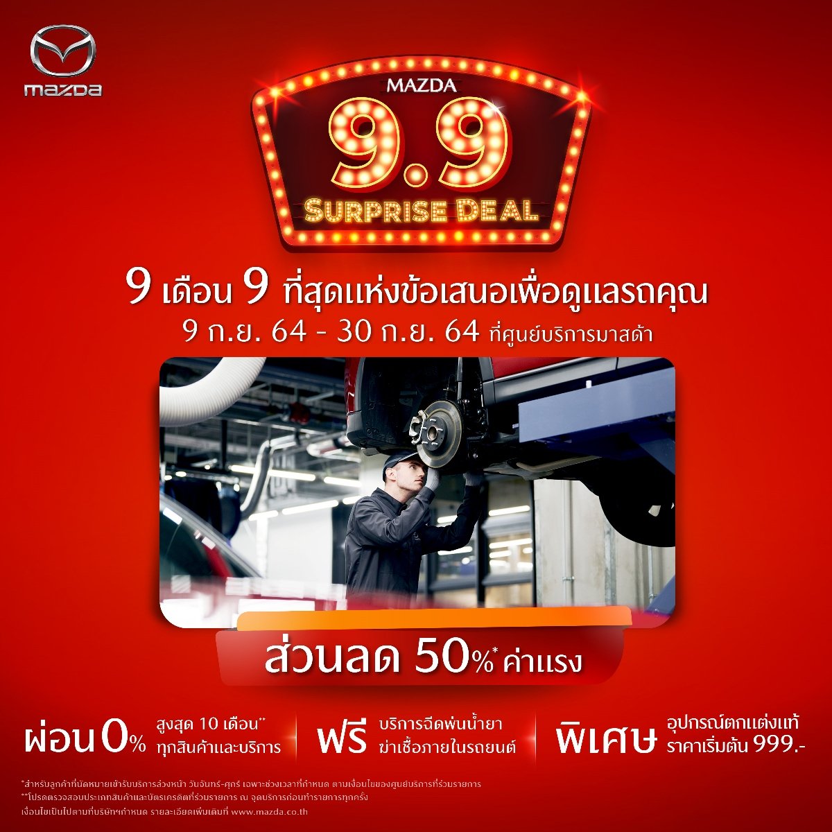 มาสด้าอัดแคมเปญแรง “Mazda 9.9 Surprise Deal” 9 เดือน 9 กับที่สุดแห่งข้อเสนอ มอบความพิเศษให้ลูกค้าที่สนใจออกรถใหม่ ระหว่างวันที่ 9 – 19 กันยายน 2564 ด้วยดอกเบี้ยต่ำสุด 0% ขับฟรี 90 วัน ฟรีประกันชั้น 1 Mazda Premium Insurance ฟรีของพรีเมี่ยมสุดพิเศษมูลค่า 690 บาท เมื่อจองภายในงานฯ ที่โชว์รูมมาสด้าทั่วประเทศ พร้อมมอบสิทธิพิเศษให้ลูกค้าที่นำรถมาเข้ารับบริการที่ศูนย์บริการมาสด้า ฟรีบริการฉีดพ่นน้ำยาฆ่าเชื้อภายในรถยนต์ รับส่วนลดค่าแรง 50% อุปกรณ์ตกแต่งแท้ราคาเริ่มต้นเพียง 999 บาท พร้อมโปรแกรมผ่อนชำระสบายๆ 0% นานสูงสุด 10 เดือน ระหว่างวันที่ 9 - 30 กันยายน 2564 นี้