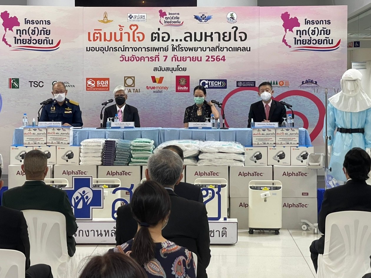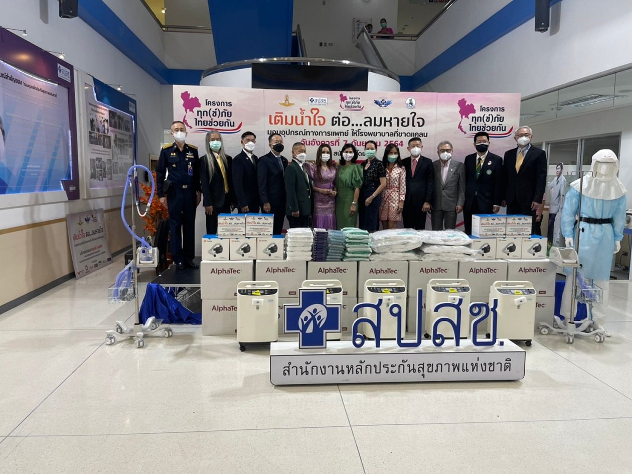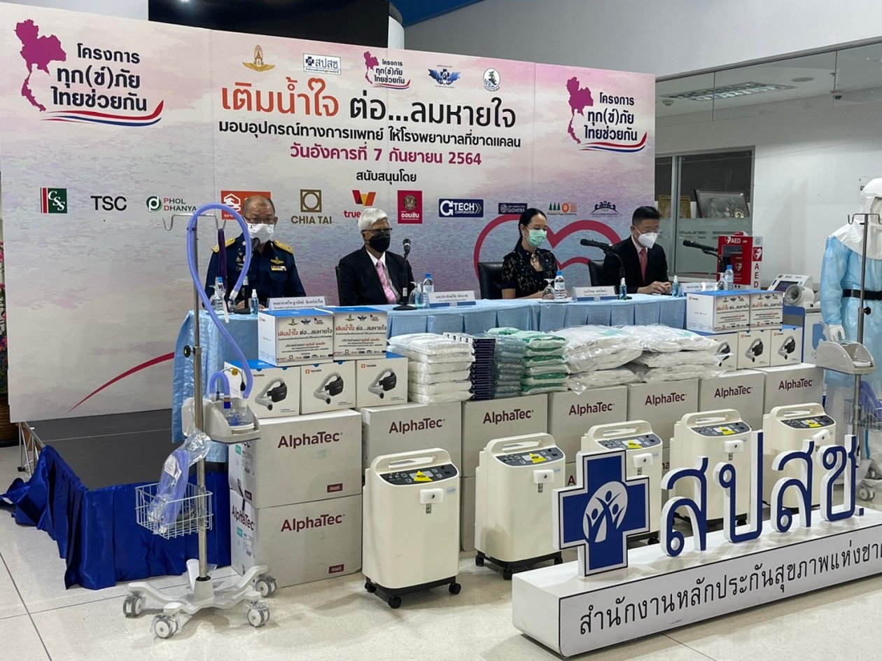 ที่สำนักงานหลักประกันสุขภาพแห่งชาติ - วันที่ 7 กันยายน 2564 ในการแถลข่าว “โครงการทุก(ข์)ภัยไทยช่วยกัน เติมน้ำใจ ต่อลมหายใจให้กับผู้ป่วยโควิด-19” โดยความร่วมมือโครงการทุก(ข์)ภัย ไทยช่วยกัน กองทัพอากาศ มูลนิธิหลักประกันสุขภาพไทย สำนักงานหลักประกันสุขภาพแห่งชาติ (สปสช.) และกรมประชาสัมพันธ์ พร้อมด้วยหน่วยงานภาครัฐและเอกชน ที่ได้การจัดหาเครื่องช่วยหายใจและอุปกรณ์การแพทย์ที่จำเป็น เพื่อส่งมอบไปยังพื้นที่ต่างๆ เพื่อช่วยบรรเทาทุกข์ให้พี่น้องคนไทยในสถานการณ์การแพร่ระบาดของโรคโควิด-19