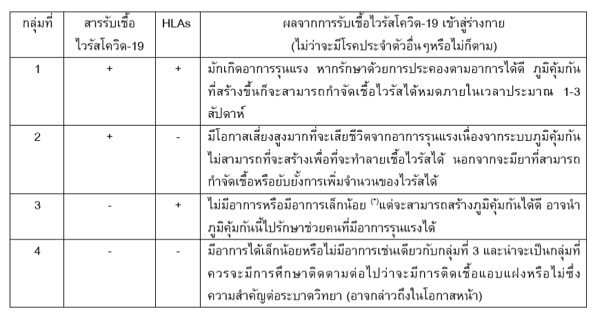 ปกติแล้วเมื่อร่างกายได้รับเชื้อใดๆ ก็ตามจะมีการกระตุ้นให้ร่างกายสร้างภูมิคุ้มกันที่จำเป็นต้องมี “สาร HLAs หรือสารพันธุกรรมทางภูมิคุ้มกัน” มาเกี่ยวข้องด้วย ดังนั้นเมื่อเชื้อโควิด-19 เข้ามาในร่างกายก็ไม่ใช่ว่าทุกๆคนสามารถตอบสนองต่อเชื้อไวรัสได้ การกระตุ้นภูมิคุ้มกันโดยเฉพาะเม็ดเลือดขาวที่เรียกว่า “ทีเซลล์” (ซึ่งมีประสิทธิภาพสูงที่สุดในการกำจัดเซลล์ติดเชื้อไวรัส) จำเป็นต้องมีโมเลกุล HLAs ชนิดที่เหมาะสม โดย HLAs ก็มีความหลากหลายสูงมากเช่นกัน (ทั้งนี้ โอกาสที่แต่ละคนจะมีสาร HLAs เหมือนกันมีน้อยมากโดยมักพบได้จากคนที่เป็นฝาแฝดไข่ใบเดียวกัน) การที่เราแต่ละคนมีสาร HLAs ที่แตกต่างกันจึงทำให้การสร้างภูมิคุ้มกันต่อเชื้อโควิด-19 ของแต่ละคนมีความแตกต่างกันไป ขึ้นกับความจำเพาะของไวรัสโควิด-19 กับชนิดของ HLAs ในแต่ละคนว่าจะรวมตัวกันได้หรือไม่เพื่อกระตุ้นเม็ดเลือดขาว “ทีเซลล์” ให้สร้างภูมิคุ้มกันขึ้นมา