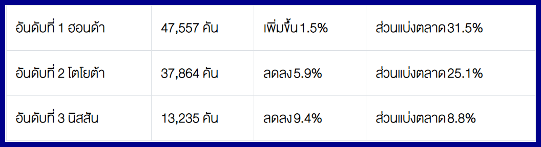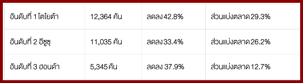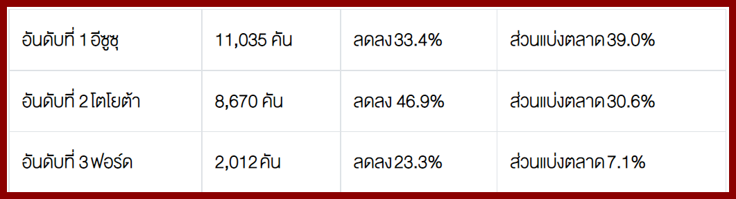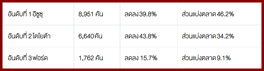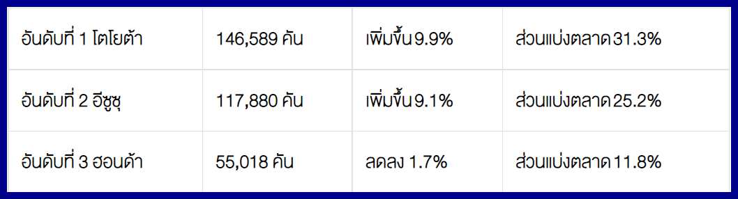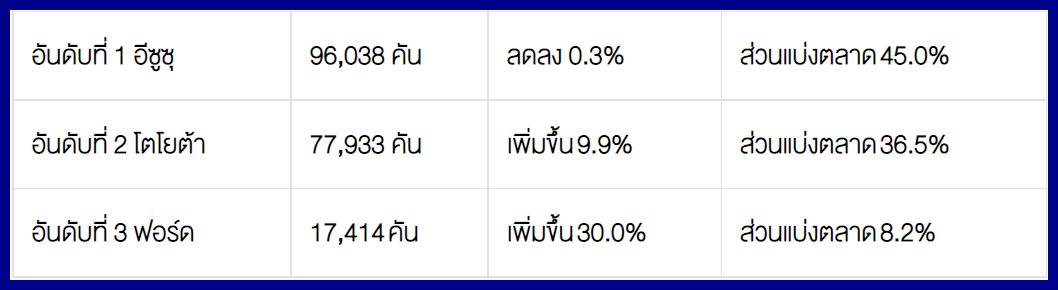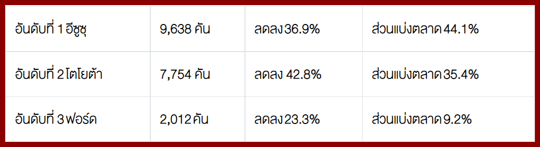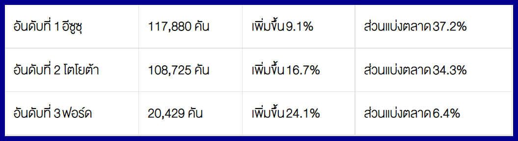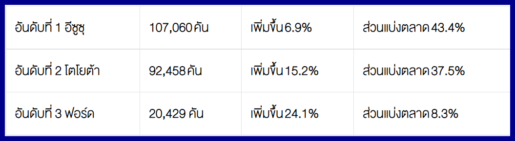 โตโยต้า 14,525 คัน - อีซูซุ 11,022 คัน - มิตซูบิชิ 4,204 คัน – ฟอร์ด 3,015 คัน – นิสสัน 357 คัน