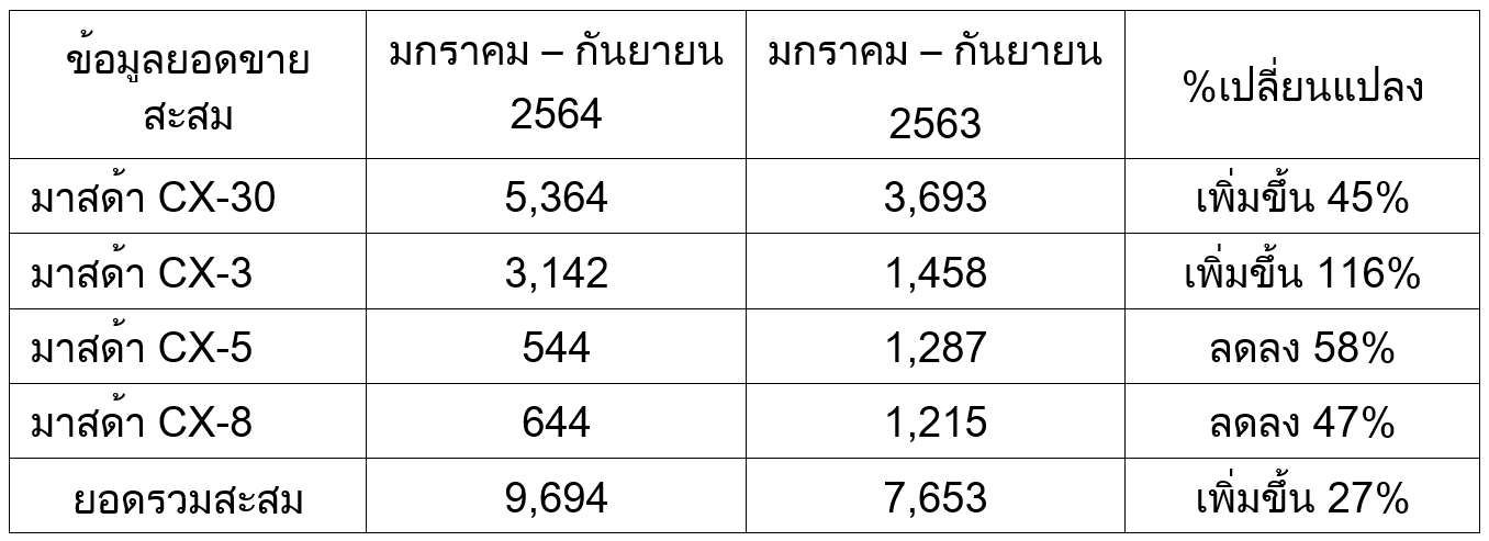 สถิติยอดจำหน่ายรถอเนกประสงค์เอสยูวีมาสด้า เดือนมกราคม – กันยายน 2564 เปรียบเทียบกับปี 2563