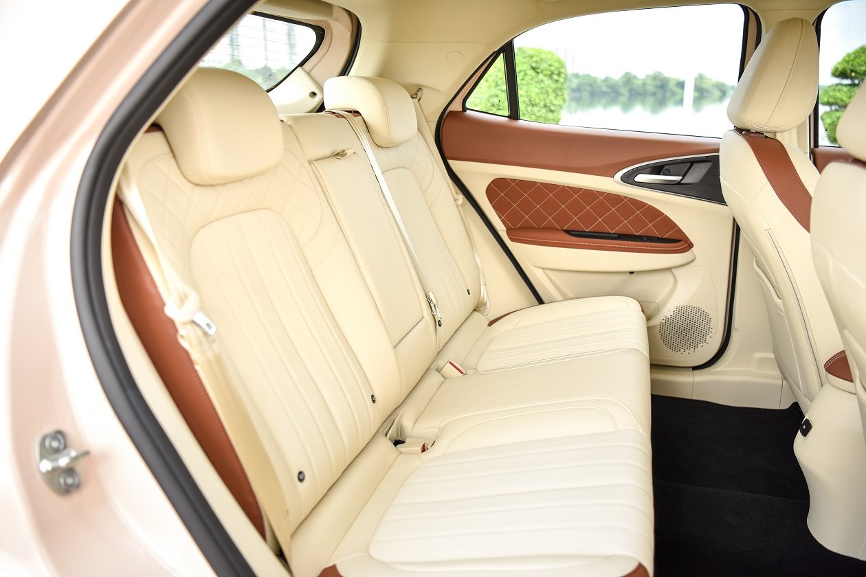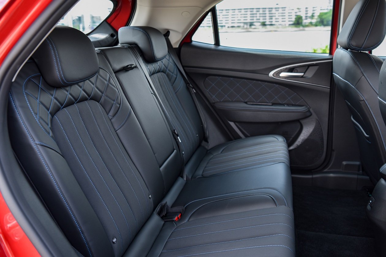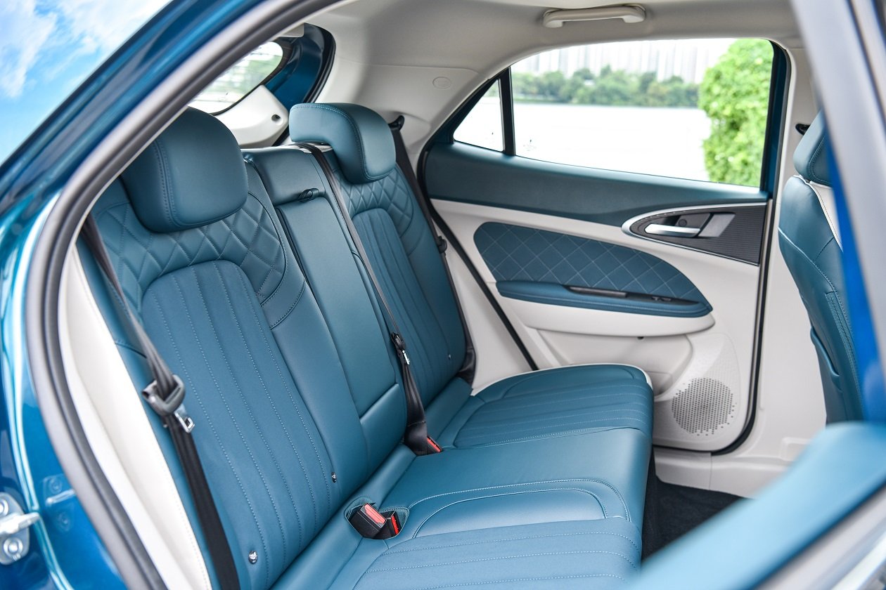 เบาะนั่งทางด้านหลังออกแบบสไตล์เดียวกับเบาะคู่หน้า พับแยก 60:40 ได้ แต่ส่วนรองนั่งจะแบนกว่า และพื้นรถจะถูกยกสูงกว่ารถทั่วไป เพราะด้านล่างจะเป็นที่อยู่ของชุดแบตเตอรี่ ทำให้ตำแหน่งท่านั่งจะเหมือนยกขาสูงขึ้นกว่ารถทั่วๆ ไป แต่ก็ไม่ถือว่านั่งลำบาก แต่อย่างใด พื้นที่ Leg Room สบายๆ ทั้งด้านหน้า และด้านหลัง ส่วนพื้นที่เหนือศีรษะ ทางด้านหน้าเหลือแบบสบายๆ ส่วนด้านหลังก็เหลือในระดับที่คนสูง 173 ซม. นั่งได้ไม่อึดอัด
