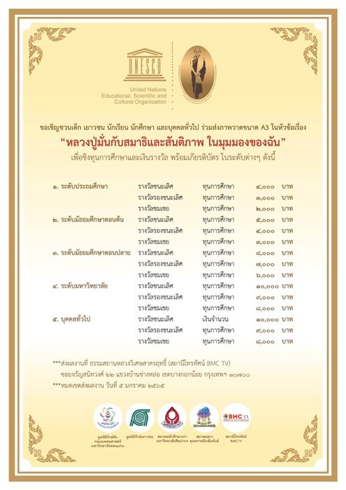 ร่วมน้อมรำลึก 152 ปีชาตกาล หลวงปู่มั่น ภูริทัตโต บุคคลสำคัญของโลก สาขาสันติภาพ กับกิจกรรมการประกวดภาพวาด ในหัวข้อเรื่อง “หลวงปู่มั่นกับสมาธิและสันติภาพ ในมุมมองของฉัน” ชิงทุนการศึกษาและเงินรางวัลพร้อมเกียรติบัตร หนึ่งในกิจกรรมงานน้อมรำลึก 152 ปีชาตกาล หลวงปู่มั่น ภูริทัตโต ระหว่างวันที่ 19-20 มกราคม 2565 ณ ธรรมสถานหลวงวิเศษสาครฤทธิ์ (สถานีโทรทัศน์ BMC TV) ซอยจรัญสนิทวงศ์ 22 แขวงบ้านช่างหล่อ เขตบางกอกน้อย กรุงเทพฯ