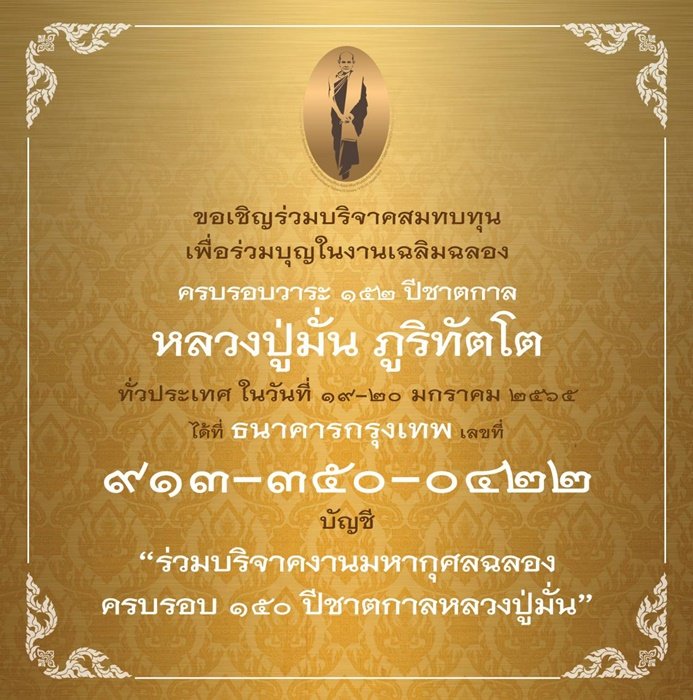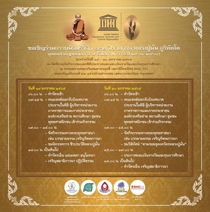ด้านกิจกรรมน้อมรำลึก 152 ปีชาตกาล หลวงปู่มั่น ภูริทัตโต ที่จะมีขึ้นระหว่างวันที่ 19-20 มกราคม 2565 ณ ธรรมสถานหลวงวิเศษสาครฤทธิ์ (สถานีโทรทัศน์ BMC TV) ซอยจรัญสนิทวงศ์ 22 แขวงบ้านช่างหล่อ เขตบางกอกน้อย กรุงเทพฯ