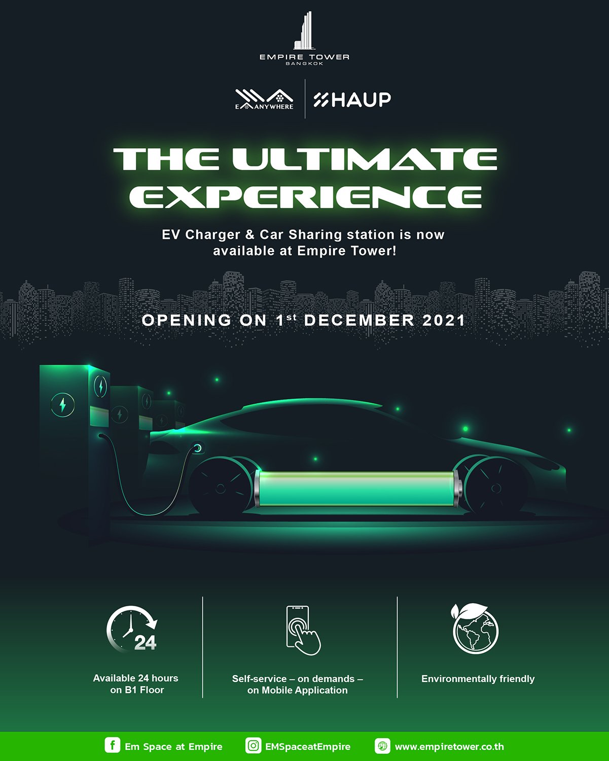 แอสเสท เวิรด์ คอร์ปอเรชั่น (AWC) บริษัทในเครือทีซีซี กรุ๊ป (TCC Group) กลุ่มบริษัทพัฒนาอสังหาริมทรัพย์ชั้นนำที่มุ่งตอบสนองไลฟ์สไตล์แบบครบวงจรของประเทศไทย มุ่งมั่นพัฒนาธุรกิจด้วยความใส่ใจในสิ่งแวดล้อมและมุ่งเน้นการใช้พลังงานอย่างสมาร์ท ได้เตรียมติดตั้งสถานีอัดประจุไฟฟ้าสำหรับยานยนต์ไฟฟ้าปลั๊กอินไฮบริดและยานยนต์ไฟฟ้าแบตเตอรี่โดย EA Anywhere พร้อมบริการรถยนต์ไฟฟ้าจาก HAUP แบบ Carsharing ที่สามารถจองผ่านแอปพลิเคชั่นเพื่อใช้งานได้ตลอด 24 ชั่วโมง ตั้งแต่วันที่ 1 ธ.ค. 64 ณ อาคารเอ็มไพร์ ทาวเวอร์ ชั้น B1 เป็นต้นไป