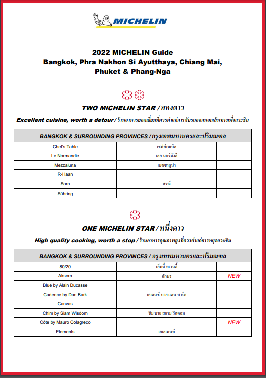 ในงานเปิดตัวคู่มือ ‘มิชลิน ไกด์ กรุงเทพมหานคร พระนครศรีอยุธยา เชียงใหม่ ภูเก็ตและพังงา 2565’ (The MICHELIN Guide Bangkok, Phra Nakhon Si Ayutthaya, Chiang Mai, Phuket & Phang-Nga 2022) ซึ่งเป็นคู่มือแนะนำร้านอาหารและที่พัก ‘มิชลิน ไกด์’ ฉบับที่ 5 ของประเทศไทย มิชลินได้ประกาศรายชื่อร้านอาหารที่คว้ารางวัล ‘ดาวมิชลิน’ (MICHELIN Star), รางวัล “ดาวมิชลินรักษ์โลก” (MICHELIN Green Star), รางวัล MICHELIN Guide Young Chef Award และรางวัล MICHELIN Guide Service Award