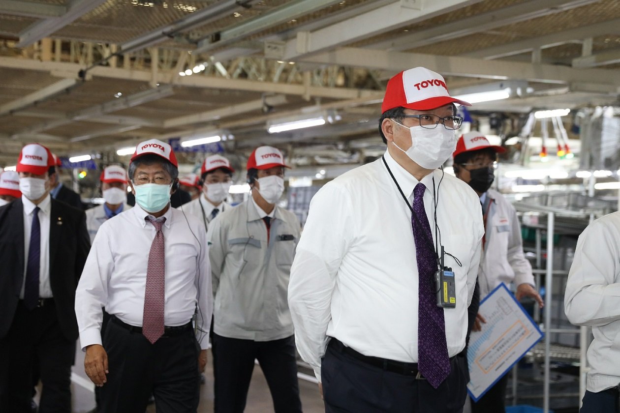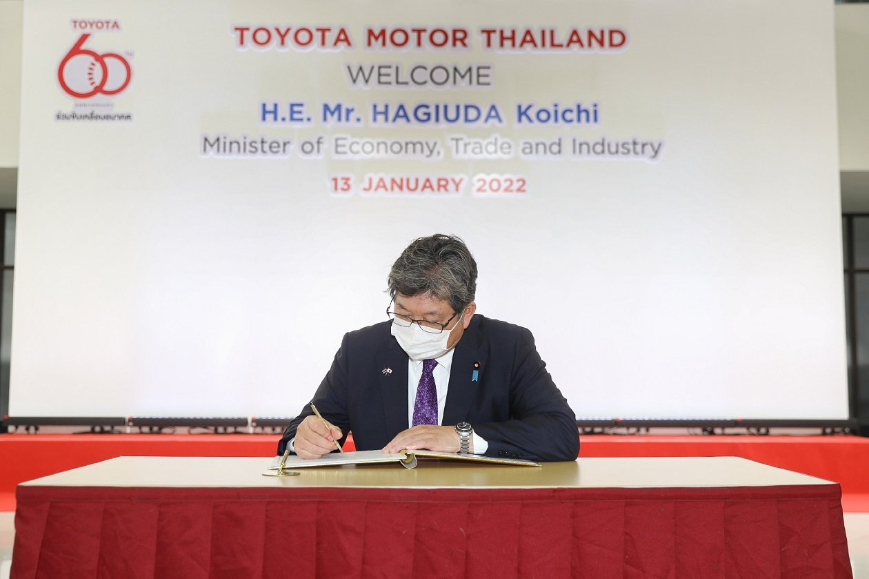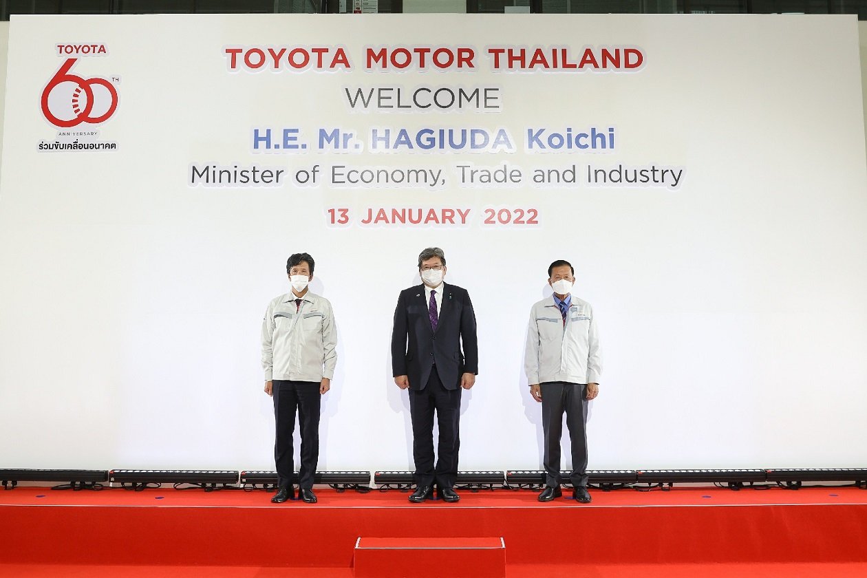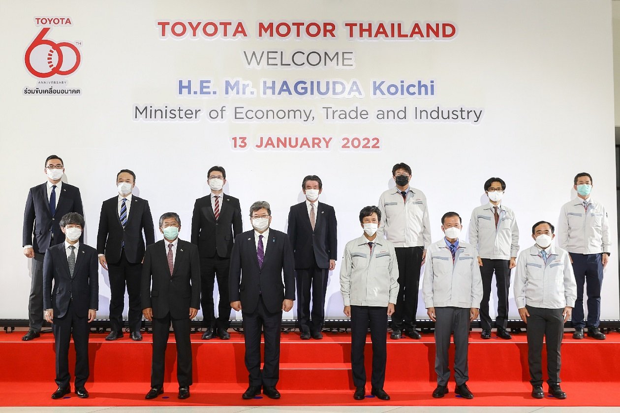 คณะผู้บริหารระดับสูงของ บริษัท โตโยต้า มอเตอร์ ประเทศไทย จำกัด ให้การต้อนรับ มร. โคอิจิ ฮากิอูดะ รัฐมนตรีว่าการกระทรวงเศรษฐกิจ การค้าและอุตสาหกรรมญี่ปุ่น และ มร. นาชิดะ คาสุยะ เอกอัครราชทูตวิสามัญผู้มีอำนาจเต็มแห่งญี่ปุ่นประจำราชอาณาจักรไทย ในโอกาสเข้าเยี่ยมชมการดำเนินงานของ บริษัท โตโยต้า มอเตอร์ ประเทศไทย จำกัด ณ สำนักงานใหญ่ โรงงานโตโยต้า สำโรง ในวันที่ 13 มกราคม 2565