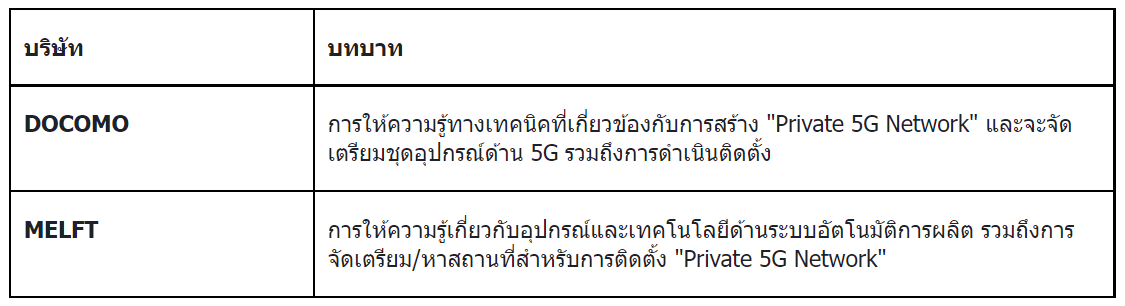 Mitsubishi Electric ร่วมกับ NTT DOCOMO, INC. หรือ DOCOMO ผู้นำการให้บริการด้านเทคโนโลยีเครือข่ายการสื่อสารในประเทศญี่ปุ่น ตัดสินใจขยาความร่วมมือเพื่อเข้าร่วมเป็นเครือข่ายพันธมิตร e-F@ctory’s Alliance หรือ Digital Manufacturing Ecosystem ในประเทศไทย กับ Mitsubishi Electric Factory Automation (Thailand) เพื่อนำเทคโนโลยี "Private 5G Network" มาช่วยในการร่วมพัฒนาอุตสาหกรรมในประเทศไทยเพื่อร่วมสนับสนุนนโยบาย Thailand 4.0 ของภาครัฐโดยความร่วมมือกันครั้งนี้ถือเป็นครั้งแรกที่ทาง NTT DOCOMO INC, ประเทศญี่ปุ่นที่ได้ร่วมมือกับพันธมิตรในการขยายเทคโนโลยีระบบเครือข่ายการสื่อสารของญี่ปุ่นไปยังต่างประเทศตามแผนการโครงการร่วมทุน "Overseas Corporate 5G Solution Consortium” โดยมีแผนที่จะร่วมกันติดตั้งในพื้นที่/โรงงานต้นแบบ ในโครงการเขตพัฒนาพิเศษภาคตะวันออก (EEC) เพื่อเปิดให้ภาคอุตสาหกรรมได้เข้ามาเรียนรู้และทำความเข้าใจถึงประโยชน์ของ "Private 5G Network" ที่สอดคล้องกับความต้องการ โดยตั้งเป้าหมายว่าจะดำเนินการให้แล้วเสร็จภายไตรมาส 3 ปี พ.ศ. 2565 เพื่อมุ่งหวังในการผลักดันในการสร้างโรงงานอัจฉริยะในอุตสาหกรรมการผลิตผ่านระบบออโตเมชั่น และเทคโนโลยีไร้สาย ซึ่งแยกเป็นอิสระจากเครือข่ายการสื่อสารสาธารณะ เพื่อเพิ่มศักยภาพในการประมวลผลเพื่อปรับปรุง และเพิ่มประสิทธิภาพการผลิต โดยเน้นให้ความสำคัญเป็นการเฉพาะสำหรับด้านความปลอดภัยเพื่อป้องกันการเข้าถึงและรั่วไหลของข้อมูลของผู้ประกอบการ
