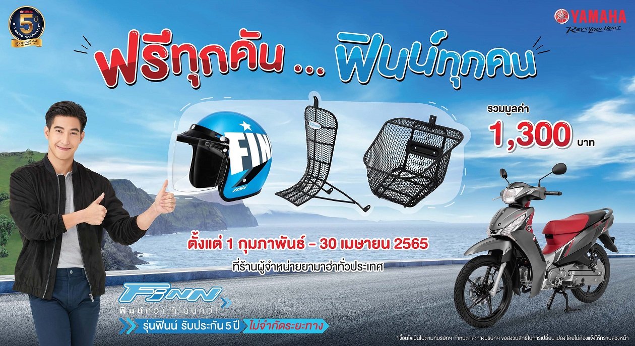บริษัท ไทยยามาฮ่ามอเตอร์ จำกัด ผู้ผลิตและจำหน่ายรถจักรยานยนต์คุณภาพของเมืองไทย จัดเต็มกับโปรโมชั่นสุดคุ้ม ”ฟรีทุกคัน...ฟินน์ทุกคน” เมื่อซื้อรถจักรยานยนต์ ยามาฮ่า ฟินน์ ระหว่างวันที่ 1 กุมภาพันธ์ – 30 เมษายน 2565 รับของแถมฟรีทันที 3 รายการ รวมมูลค่า 1,300 บาท ได้แก่ 1.หมวกกันน็อก Finn 1 ใบ 2.ตะกร้าหน้า 1 ชิ้น 3.กันลาย 1 ชิ้น พร้อมเพิ่มความมั่นใจในคุณภาพสินค้ากับการรับประกันทั้งคัน 5 ปี ไม่จำกัดระยะทาง กล้าที่จะไป กล้าที่จะเป็น #กล้าที่จะฟินน์