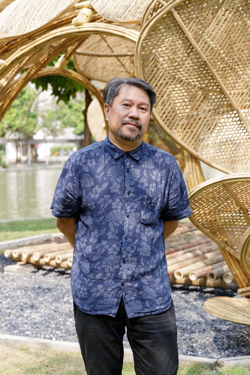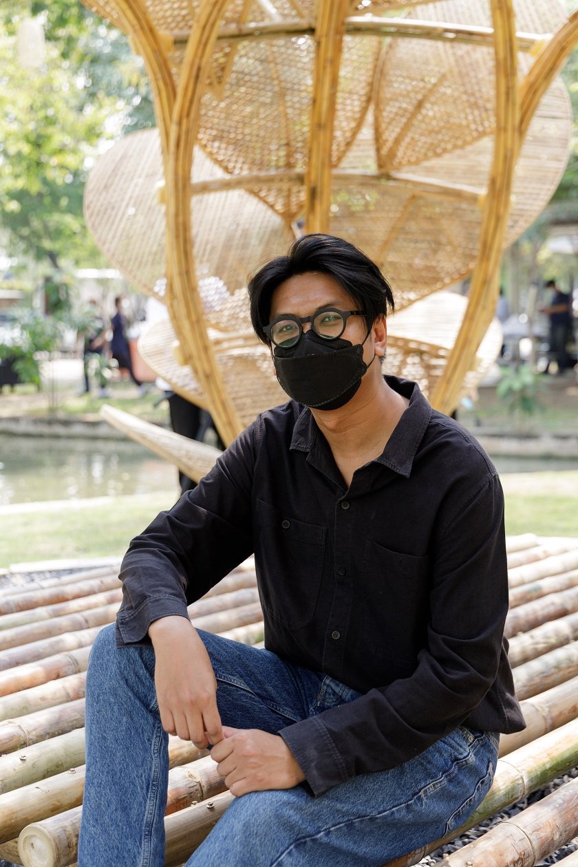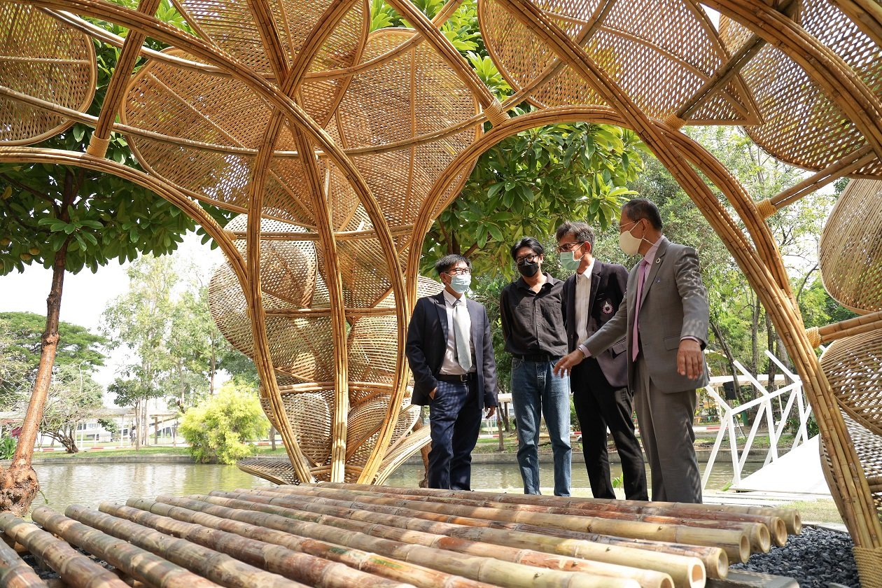 ด้านคุณธนพัฒน์ บุญสนาน ศิลปิน และสถาปนิกไม้ไผ่ บริษัท ธ ไก่ชน จำกัด ที่ปรึกษาในการก่อสร้างศาลาไม้ไผ่ กล่าวว่า “ในฐานะที่ได้รับเชิญมาร่วมโครงการก่อสร้างศาลาไม้ไผ่เพื่อการเรียนรู้ เริ่มตั้งแต่ทำการก่อสร้างส่วนของพื้นยกระดับของศาลาไม้ไผ่กลางน้ำ โดยมีนักศึกษาคณะสถาปัตยกรรมศาสตร์ มหาวิทยาลัยรังสิต ร่วมสังเกตการณ์การก่อสร้าง พร้อมลงมือฝึกหัดร่วม ระหว่างการก่อสร้างหลังจากได้รับโจทย์มา ได้มีการแลกเปลี่ยนแนวคิด พัฒนาแบบร่วมกัน รวมถึงดูเรื่องกรรมวิธีในการออกแบบ และก่อสร้างศาลา สำหรับศาลาไผ่ได้มีการปรับให้เขากับบริบทพื้นที่บริเวณของมหาวิทยาลัย เป็นรูปทรงของดอกไม้โบตั๋น หรือดอกพีโอนี (Peony) คือดอกไม้ที่มีความสำคัญและเป็นดอกไม้สัญลักษณ์ของประเทศจีน มีการปรับจากให้มีความอ่อนช้อย สนุกสนานขึ้น การเลือกวัสดุ การสานกลีบของดอกให้ดูมีความสวยงามมากขึ้น มีการนำโครงเหลือเขามาช่วยเพื่อให้เกิดความแข็งแรง ทนทานมากขึ้น ซึ่งจากการก่อสร้างบนพื้นที่จริงเป็นที่เรียบร้อย ด้วยขนาดของพื้นที่ และตำแหน่งของการสร้างศาลา มีความเหมาะสม โดยระยะเวลาการดำเนินงานก่อสร้างประมาณ 3 สัปดาห์ อย่างไรก็ตามการได้เห็นงานสถาปัตยกรรมไผ่ เข้ามาบูรณาการในการเรียนการสอนและได้มีการลงมือปฏิบัติ ลงมือทำจริง ลงมือก่อสร้างให้ได้เห็นเชิงประจักษ์ เรียกว่าเป็นอีกหนึ่งสัญญาณที่ดีในการสร้างคุณค่าของพืชท้องถิ่นในแง่สถาปัตยกรรมของคนไทยส่งต่อคนรุ่นใหม่ได้เป็นอย่างดี”