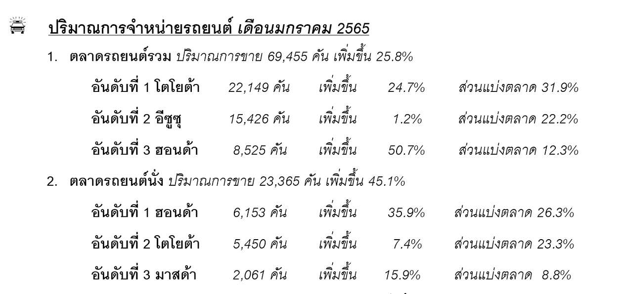 ตลาดรถยนต์เดือนมกราคม 2565 มีปริมาณการขาย 69,455 คัน เพิ่มขึ้น 25.8% เมื่อเทียบกับช่วงเดียวกันของปีที่ผ่านมา โดยตลาดรถยนต์นั่งมีอัตราการเติบโตเพิ่มขึ้น 45.1% และตลาดรถยนต์เพื่อการพาณิชย์ มีอัตราการเติบโตเพิ่มขึ้น 17.9% เนื่องจากได้ร้บแรงส่งจากแคมเปญส่งเสริมการขายในช่วงงานมหกรรมยานยนต์ในช่วงเดือนธันวาคมที่ผ่านมา ซึ่งค่ายรถยนต์ต่างทยอยส่งมอบรถที่ได้รับจองให้กับลูกค้าอย่างต่อเนื่อง ประกอบกับความเชื่อมั่นของผู้บริโภคที่ปรับตัวดีขึ้น ในการดำเนินชีวิตอย่างปลอดภัยท่ามกลางการแพร่ระบาดของไวรัส COVID 19 ที่ยังมีอยู่อย่างต่อเนื่อง