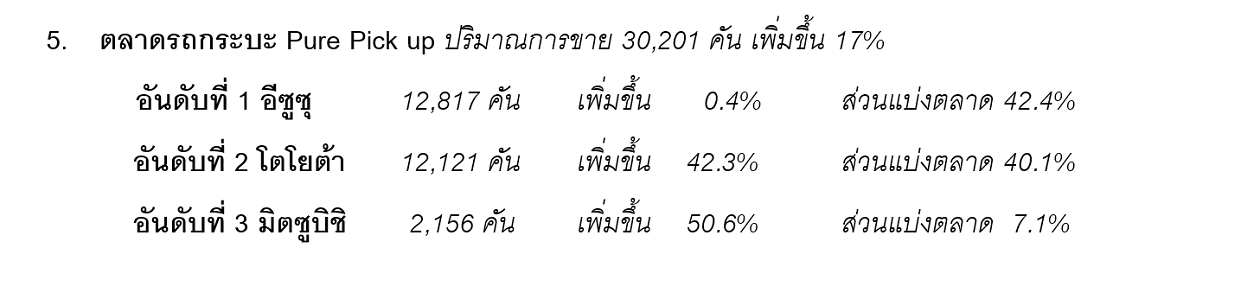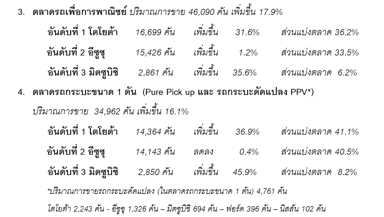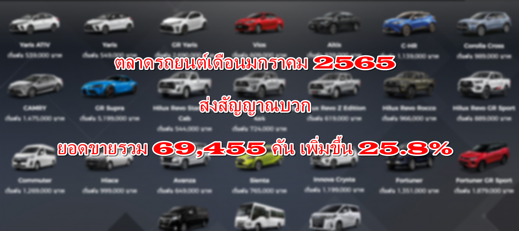 นายสุรศักดิ์ สุทองวัน รองกรรมการผู้จัดการใหญ่ บริษัท โตโยต้า มอเตอร์ ประเทศไทย จำกัด รายงานสถิติการขายรถยนต์ประจำเดือนมกราคม 2565 มียอดการขายรวมทั้งสิ้น 69,455 คัน เพิ่มขึ้น 25.8% ประกอบด้วย รถยนต์นั่ง 23,365 คัน เพิ่มขึ้น 45.1% รถยนต์เพื่อการพาณิชย์ 46,090 คัน เพิ่มขึ้น 17.9% และรถกระบะขนาด 1 ตัน ในเซกเมนท์นี้ มีจำนวน 34,962 คัน เพิ่มขึ้น 16.1%