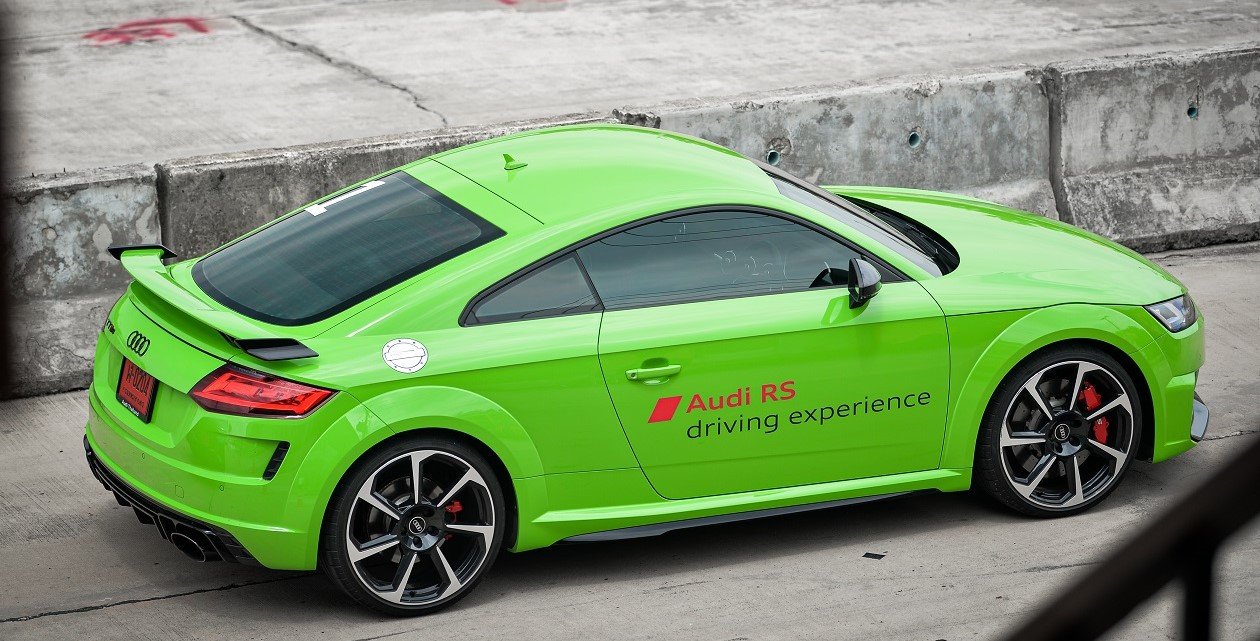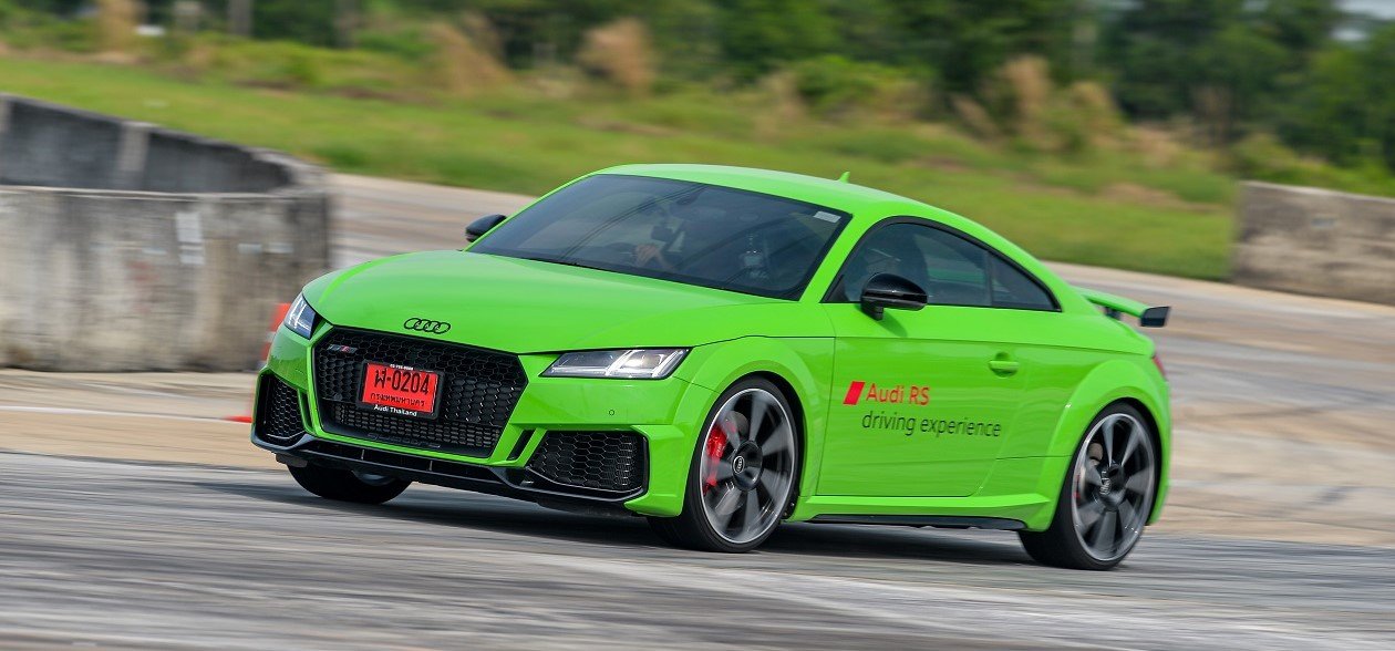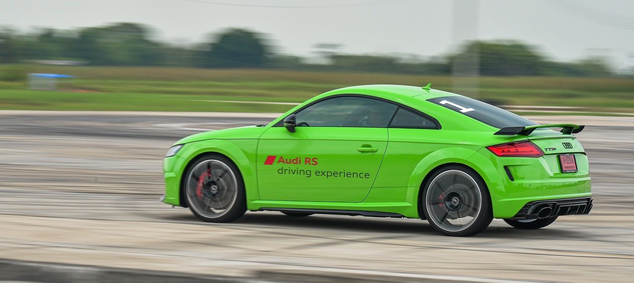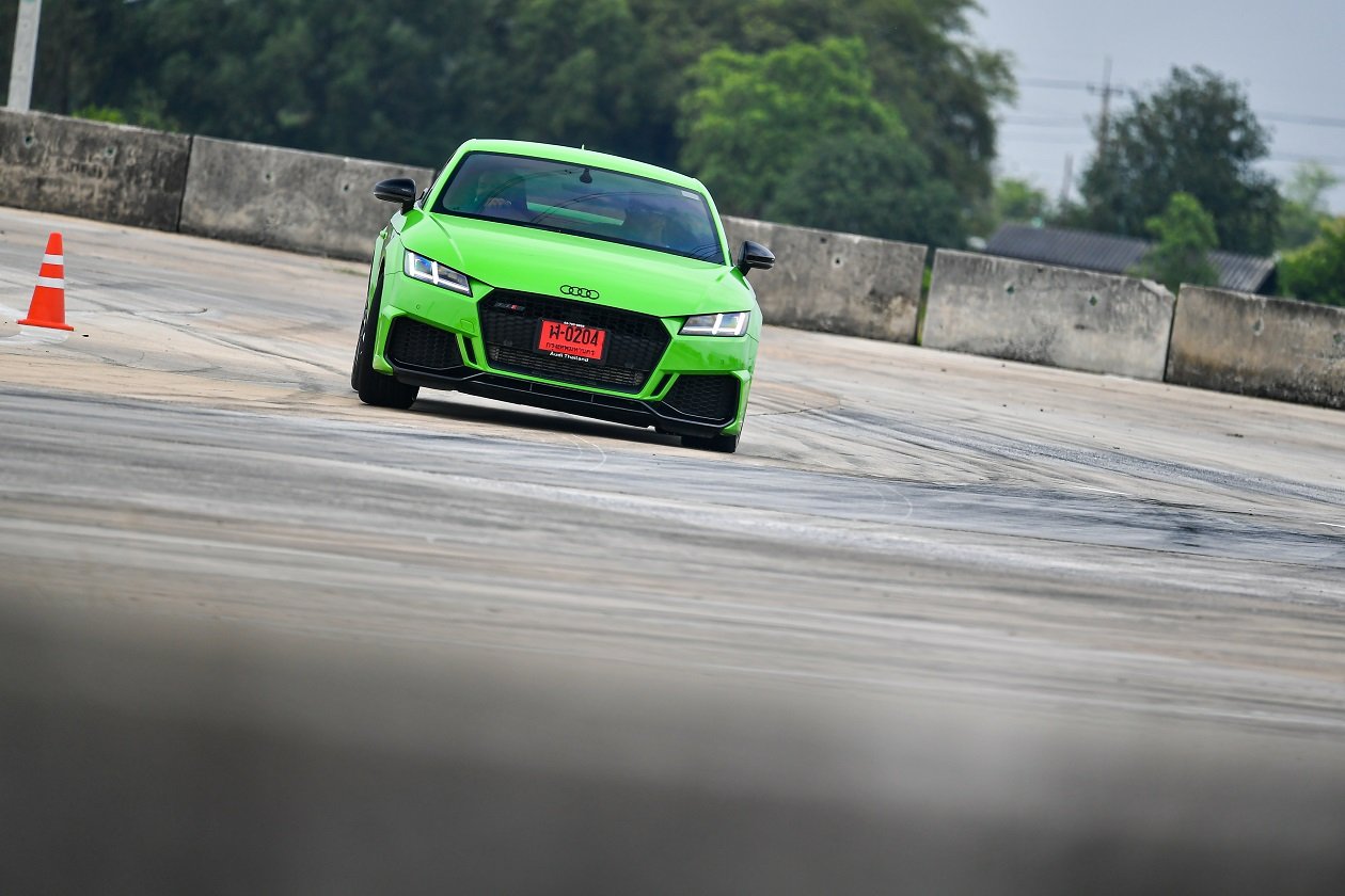 TT RS เครื่องยนต์ 5 สูบแถวเรียง เป็นรถที่มีขนาดตัวเล็กที่สุดในบรรดารถ RS ทั้งหมดที่นำมาทดลองขับในวันนี้ แต่มีพละกำลังถึง 400 แรงม้ามาให้ใช้ อัตราเร่งดีมาก ส่วนหนึ่งมาจากการที่ตัวรถมีน้ำหนักเบา และมีผลต่อการควบคุมรถโดยเฉพาะในช่วงสลาลมและเข้าโค้งกว้างๆ ด้วยความเร็วทำได้ง่าย ทิศทางของตัวรถเป็นไปตามการหมุนพวงมาลัยที่คมและแม่นยำ ความรู้สึกเดียวกับการที่ขับอยู่บนรถโกคาร์ทเลยทีเดียว แม้ว่าภายในรถจะค่อนข้างแคบแต่รถ TT RS คันนี้ขับได้สนุกจริงๆ กับราคาค่าตัว 5.399 ล้านบาท