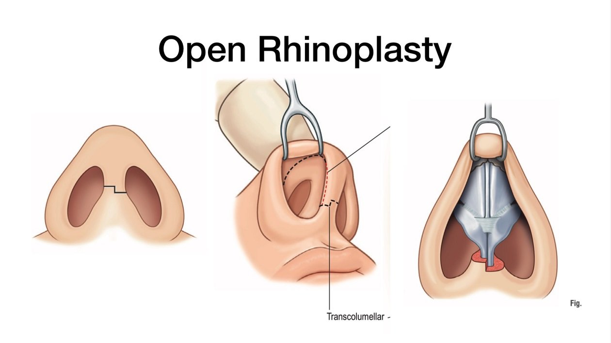 การผ่าตัดแบบเปิด (Open Rhinoplasty หรือ Open-Tip Rhinoplasty) หรือที่นิยมเรียกว่า การผ่าแบบโอเพ่น คือ จะมีแผลผ่าตัดอยู่ตรงบริเวณฐานจมูก เพื่อการผ่าตัดที่จะเชื่อมไปยังแผล ผ่าตัดด้านในรูจมูกอีกข้าง เพื่อเปิดผิวหนังของจมูกขึ้น ให้เห็นโครงสร้างทั้งหมด เพื่อการปรับแต่งโครงสร้างได้อย่างละเอียด ซึ่งการผ่าตัดศัลยกรรมจมูกแบบ Open Rhinoplasty ต้องใช้ระยะเวลาพักฟื้นนานกว่า ซึ่งควรอยู่ภายใต้การดูแลและวิเคราะห์โดยศัลยแพทย์ผู้ชำนาญการ