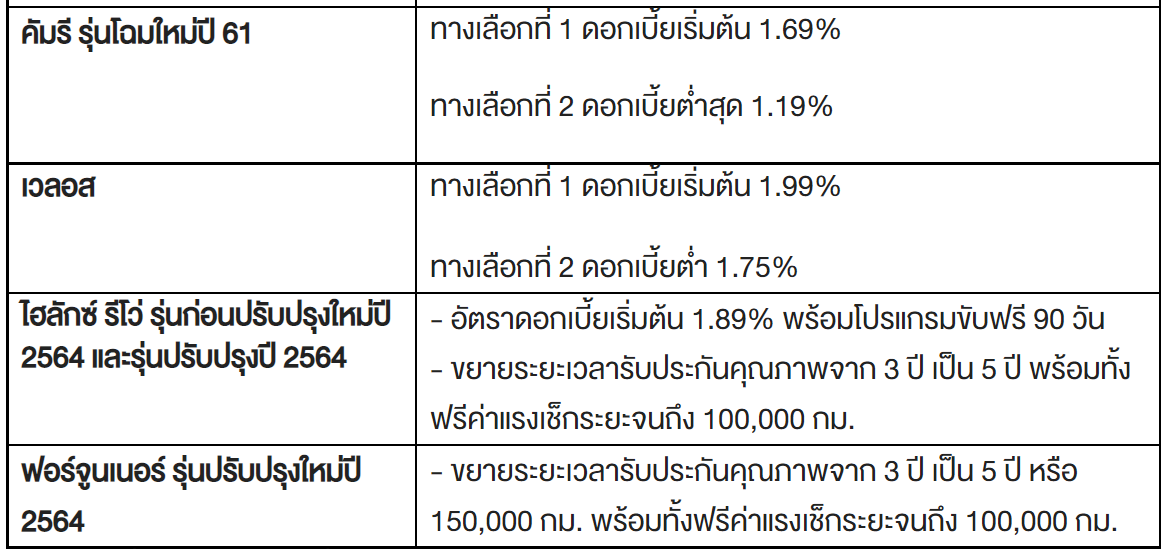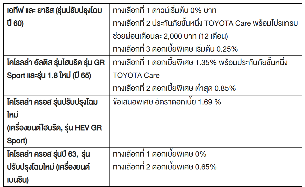 - ดอกเบี้ยต่ำ 0.99% และรับฟรีประกันภัยชั้น 1 Toyota Care