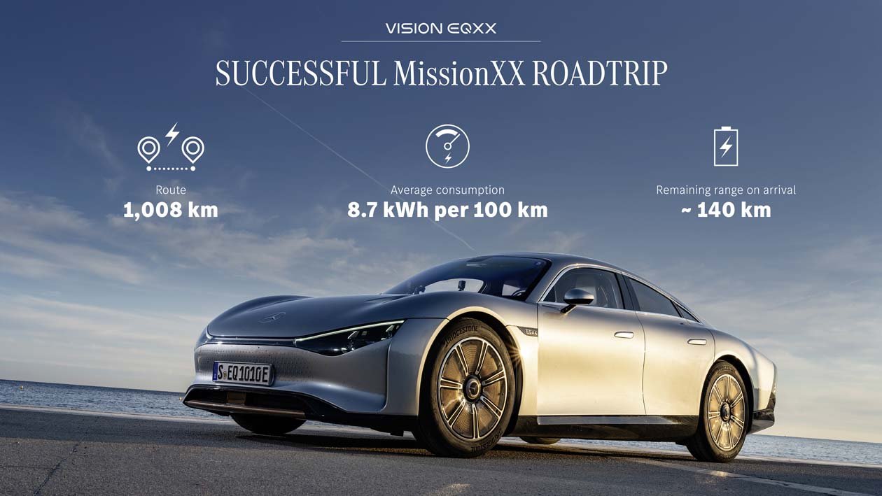 Mercedes-Benz นำรถ VISION EQXX ซึ่งเป็นรถ BEV (Battery Electric Vehicle) ทรงแอร์โร่ไดนามิคเต็มขั้น มาวิ่งทดสอบในสภาพแวดล้อมการเดินทางจริง ทั้งถนนทั่วไป และบนซูเปอร์ไฮเวย์อย่าง German autobahn (บางช่วงทำความเร็วถึง 140 กม./ชม.) เพื่อหาอัตราสิ้นเปลืองพลังงาน ได้ตัวเลขออกมาที่ 8.7 kWh/100 km พร้อมระยะการเดินทางเมื่อชาร์จแบตเต็มไกลกว่า 1,000 กิโลเมตร นั่นเป็นข้อยืนยันว่า ในเร็ววันนี้ยานยนต์ไฟฟ้า BEV จะพร้อมใช้งานแทนที่รถยนต์ใช้เครื่องยนต์สันดาปได้อย่างสมบูรณ์แบบ