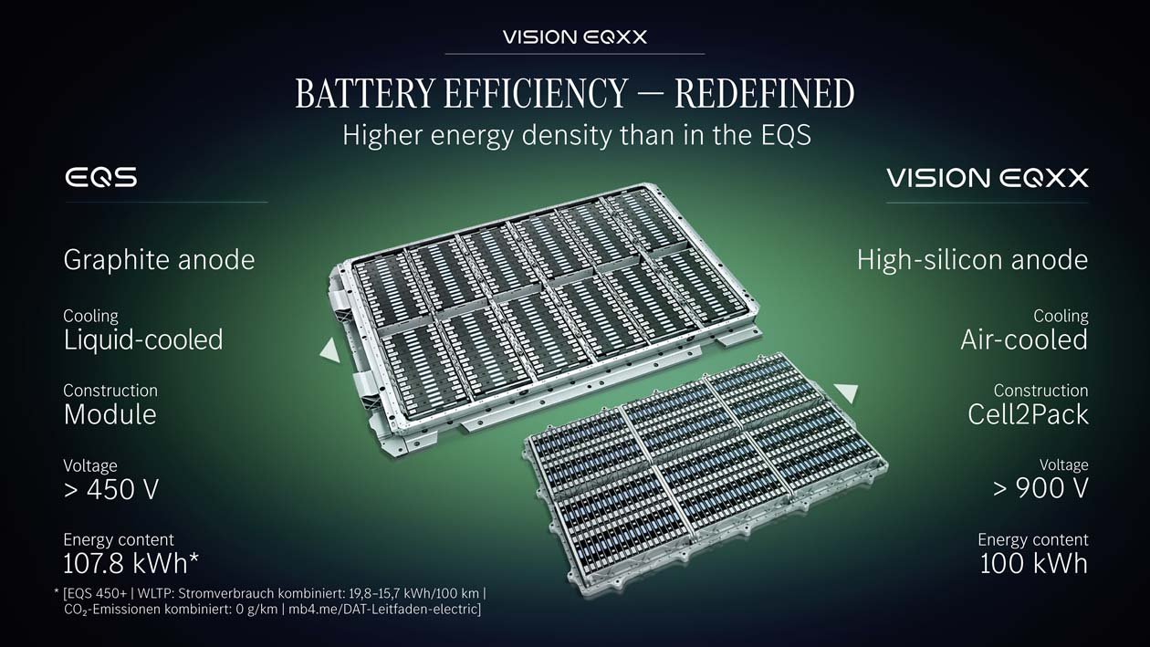 VISION EQXX กำเนิดจาก know-how ในขั้นตอน R&D ของรถ F1 และ Formular E จาก Mercedes-Benz หัวใจของการพัฒนาไม่ใช่ความแรง แต่วิศวกรมุ่งหาประสิทธิภาพสูงสุดจากการทำงานร่วมกับของทุกระบบในรถ ซึ่งถูกนำเสนอผ่านคำต่าง ๆ เหล่านี้ #EnergyDensity ออกแบบตามแนวคิดในการสร้าง F1 และ Formular E ตัวแบตเตอรี่ต้องมีความจุต่อปริมาตรที่คุ้มค่ามากที่สุด ภายใต้พื้นที่ติดตั้งอันจำกัด นั่นเป็นที่มาของ แบตเตอรี่ความจุเกือบ 100 kWh ที่มีปริมาตรลดลงถึง 50% และมีน้ำหนักน้อยลงอีก 30% เมื่อเปรียบเทียบกับแบตเตอรี่ของ EQS ซึ่งเป็น BEV รุ่นท็อปของ Mercedes-Benz, #EfficiencyOnTheRoad