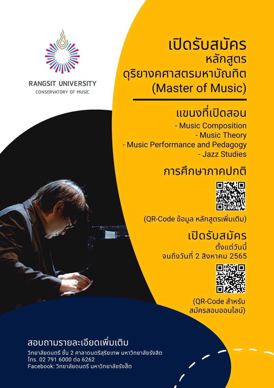 ผู้สนใจสมัครสามารถสมัครออนไลน์ได้หรือสมัครด้วยตัวเองได้ตั้งแต่วันนี้ ถึง วันที่ 2 สิงหาคม 2565 สอบถามรายละเอียดหลักสูตรได้ที่ วิทยาลัยดนตรี มหาวิทยาลัยรังสิต โทร. 02 7916000 ต่อ 6262