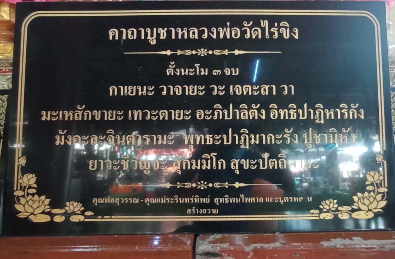 คาถาบูชาหลวงพ่อวัดไร่ขิง กาเยนะ วาจายะ วะ เจตะสา วา มเหสักขายะ เทวะตายะ อภิปาลิตัง อิทธิปาฏิหาริกัง มังคะละจินตารามะ พุทธะปฏิมากะรัง ปูชามีหัง ยาวะชีวัญจะสุกัมมิโก สุขะปัตติตถายะ