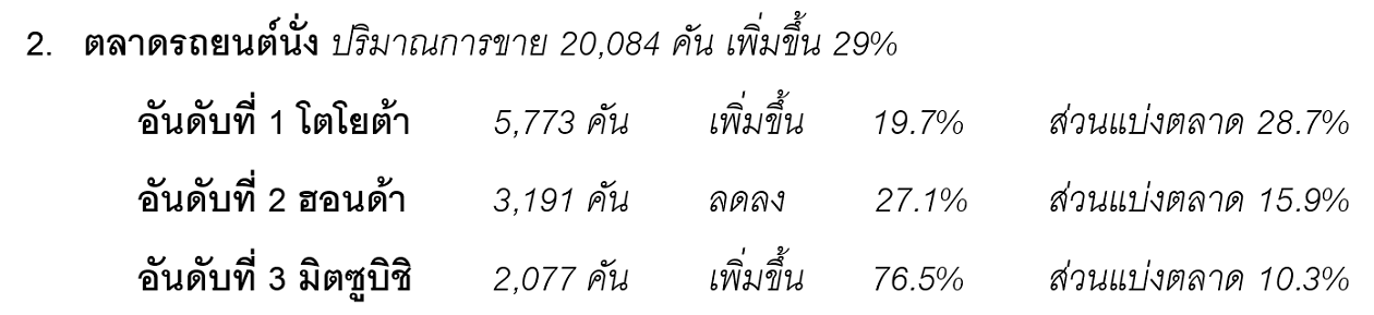 ตลาดรถยนต์เดือนพฤษภาคมมีปริมาณการขาย 64,735 คัน เพิ่มขึ้น 15.7% เมื่อเทียบกับช่วงเดียวกันของปีที่ผ่านมา โดยตลาดรถยนต์นั่งมีอัตราการเติบโตเพิ่มขึ้นถึง 29% ส่วนตลาดรถยนต์เพื่อการพาณิชย์มีอัตราการเจริญเติบโตเช่นเดียวกันที่ 10.6% เนื่องจากสถานการณ์เศรษฐกิจเริ่มฟื้นตัว ประชาชนกลับมาใช้ชีวิตในการประกอบอาชีพและกิจกรรมทางเศรษฐกิจจนเกือบเป็นปกติ แม้จะมีปัจจัยลบที่สำคัญคือสถานการณ์ราคาน้ำมันที่พุ่งสูงขึ้นอย่างต่อเนื่อง แต่ยังมีความต้องการใช้รถยนต์ของผู้บริโภคที่สูงอย่างต่อเนื่อง โดยเฉพาะอย่างยิ่งรถยนต์นั่งซึ่งมีความจำเป็นในการเดินทางที่สะดวก ปลอดภัย ลดความเสี่ยงในการรักษาระยะห่างทางสังคม (Social distancing) เพื่อให้ปลอดภัยจากโรคระบาด โควิด-19