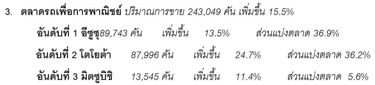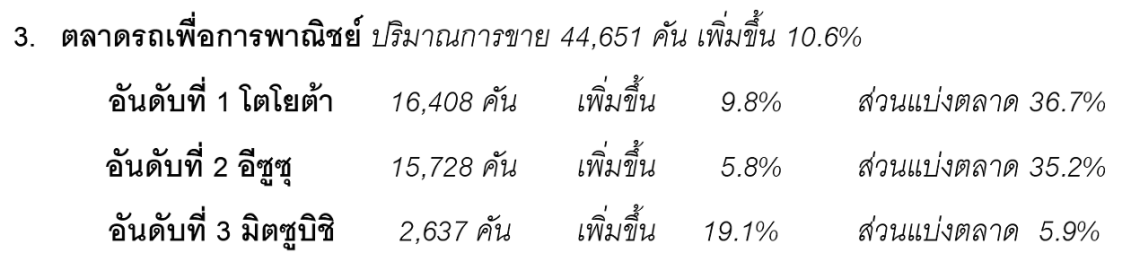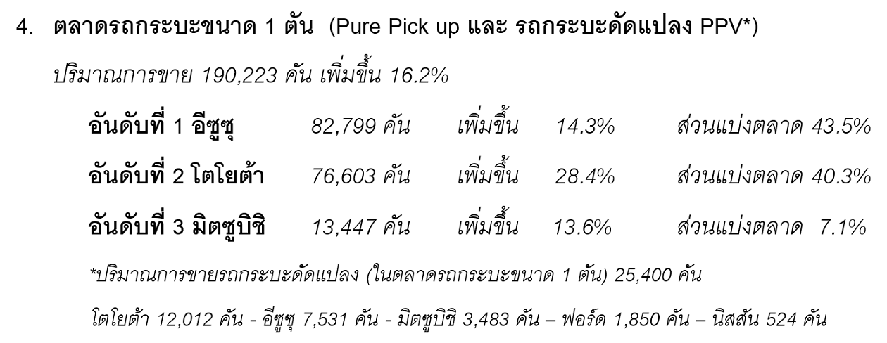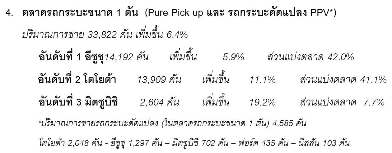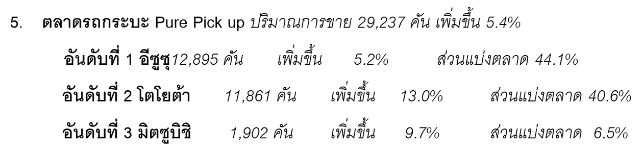 นายสุรศักดิ์ สุทองวัน รองกรรมการผู้จัดการใหญ่ บริษัท โตโยต้า มอเตอร์ ประเทศไทย จำกัด รายงานสถิติการขายรถยนต์ประจำเดือนพฤษภาคม 2565 มีตัวเลขการขายรวมทั้งสิ้น 64,735 คัน เพิ่มขึ้น 15.7% ประกอบด้วย รถยนต์นั่ง 20,084 คัน เพิ่มขึ้น 29% รถยนต์เพื่อการพาณิชย์ 44,651 คัน เพิ่มขึ้น 10.6% และรถกระบะขนาด 1 ตัน ในเซกเมนท์นี้ มีจำนวน 33,822 คัน เพิ่มขึ้น 6.4%