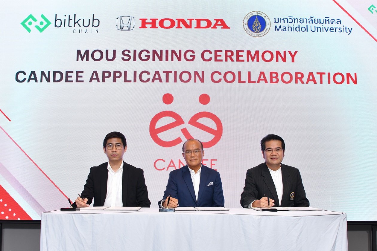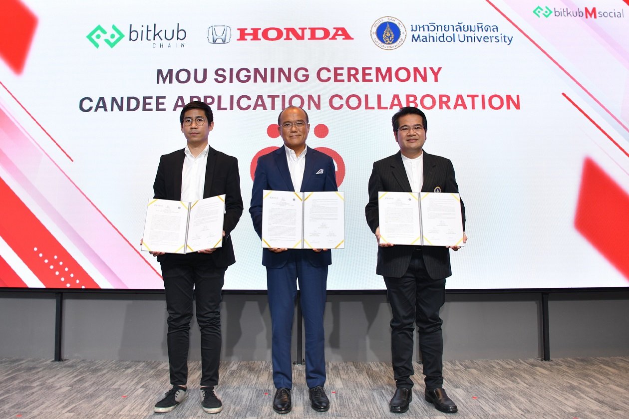 บริษัท ฮอนด้า ออโตโมบิล (ประเทศไทย) จำกัด นำโดย นายพิทักษ์ พฤทธิสาริกร (กลาง) ประธานคณะกรรมการ ร่วมกับ บริษัท บิทคับ บล็อกเชน เทคโนโลยี จำกัด นำโดย นายภาสกร ปานนอก (ซ้าย) ประธานเจ้าหน้าที่บริหาร และคณะเทคนิคการแพทย์ มหาวิทยาลัยมหิดล นำโดย ศาสตราจารย์ ดร.ฉัตรเฉลิม อิศรางกูร ณ อยุธยา (ขวา) คณบดีคณะเทคนิคการแพทย์ ลงนามความร่วมมือในแอปพลิเคชัน CANDEE แพลตฟอร์มจากเทคโนโลยีบล็อกเชนในการบันทึกความดีและสุขภาพ เพื่อสร้างการเปลี่ยนแปลงเชิงบวก ณ Bitkub M Social ศูนย์การค้าเอ็มควอเทียร์