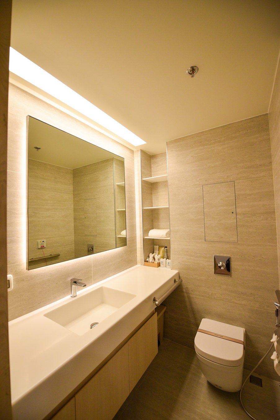 2. Functionality: เพิ่มประสิทธิภาพในการทำงานของแพทย์และผู้ปฏิบัติงาน โดยให้ความสำคัญในการออกแบบแสงไฟเป็นพิเศษด้วยระบบควบคุมแสงสว่างให้ทันสมัยมากขึ้น ปรับได้ถึง 6 โหมด สามารถปรับโทนแสงเป็นกลางวันและกลางคืนได้ตามต้องการ และยังสามารถปรับระดับความสว่างให้สอดคล้องกับสภาพของแสงภายนอกอาคาร เพื่อเป็นการประหยัดพลังงาน รวมถึงตำแหน่งของไฟส่องสว่างที่ถูกออกแบบไว้ให้สอดคล้องกับการปฏิบัติงานของผู้ดูแลผู้ป่วยได้อย่างเหมาะสม ทั้งในเวลากลางวันและกลางคืน เช่น แสงไฟโหมด doctor scene สำหรับเวลาที่แพทย์เข้ามาตรวจผู้ป่วย ซี่งต้องมีความสว่างมากเป็นพิเศษ หรือโหมด night scene ช่วงเวลานอนที่ต้องการแสงสว่างน้อยมากๆ หรือเมื่อเข้าห้องน้ำกลางดึก หรือกรณีที่พยาบาลเข้ามาดูแลในตอนกลางคืนเพื่อไม่เป็นการรบกวนผู้ป่วยและยังคงในเรื่องความปลอดภัยอีกด้วย นอกจากนี้ ยังคำนึงถึงตำแหน่งการวางเฟอร์นิเจอร์เพื่อความสะดวกรวดเร็วในการนำเครื่องมืออุปกรณ์ทางการแพทย์เข้าออก และการเคลื่อนย้ายผู้ป่วย เพื่อให้กระบวนการทำงานเป็นไปอย่างราบรื่นและเกิดประสิทธิภาพสูงสุด