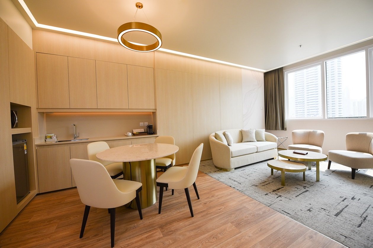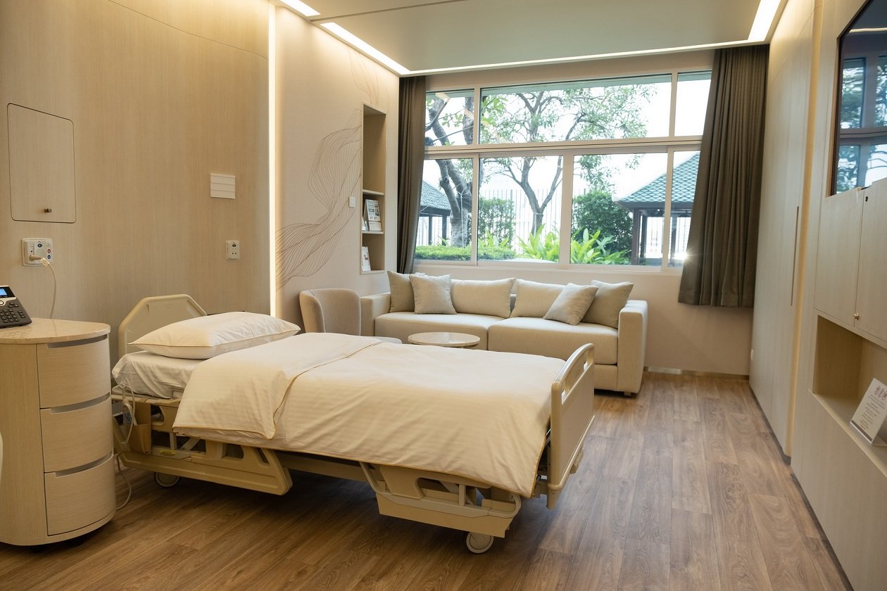 3. Emotional wellbeing: สร้างสภาพแวดล้อมให้ผู้มารับบริการได้ฟื้นฟูสภาพจิตใจและพักผ่อนอย่างเต็มที่ จากผลศึกษาวิจัยการออกแบบ mood & tone ให้เป็นธรรมชาติจะทำให้รู้สึกสบายและผ่อนคลายมากที่สุด จึงได้ปรับเลือกวัสดุจากธรรมชาติ รวมถึงโทนสีและการใช้แสงไฟภายในห้องให้รู้สึกอบอุ่น อีกทั้งออกแบบหน้าต่างบานใหญ่เพื่อให้รับแสงธรรมชาติและเห็นวิวภายนอกได้อย่างเต็มที่ ทั้งวิวสวนหย่อมลอยฟ้า เพื่อให้ผู้ป่วยได้เห็นพื้นที่สีเขียว ทำให้รู้สึกสบายตาและการพักผ่อนได้มากขึ้น และวิวของตัวเมือง เสมือนพักผ่อนอยู่ที่บ้านหรือมาพักผ่อนในโรงแรม 5 ดาว โดยเน้นความเป็นธรรมชาติ สะอาด และปลอดภัย รวมถึงเพิ่มสิ่งอำนวยความสะดวกต่างๆ อาทิ โซนเตรียมอาหาร ตู้เย็น ไมโครเวฟ ปรับขนาดของโซฟาให้ใหญ่ขึ้นเพื่อความสบายขณะพักผ่อน ปรับขนาดจอทีวีเพื่อให้เหมาะสมกับระยะชมจากเตียงผู้ป่วยและเพิ่มช่องให้มีความหลากหลายในรูปแบบ Infotainment ด้วย Internet และ wi-fi ความเร็วสูง เพื่ออรรถรสในการรับชม