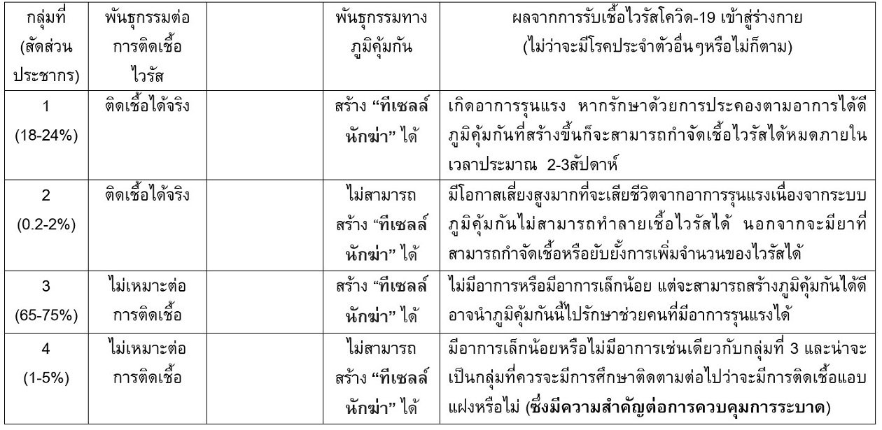เพื่อให้กระชับขอให้ดูจากตารางที่นำเสนอ ซึ่งแบ่งเราแต่ละคนเป็น 4 กลุ่มจากความหลากหลายทาง “พันธุกรรมต่อการติดเชื้อ” และ ”พันธุกรรมทางภูมิคุ้มกัน” โดยจากการประเมินข้อมูลน่าจะมีสัดส่วนของแต่ละกลุ่มดังแสดง