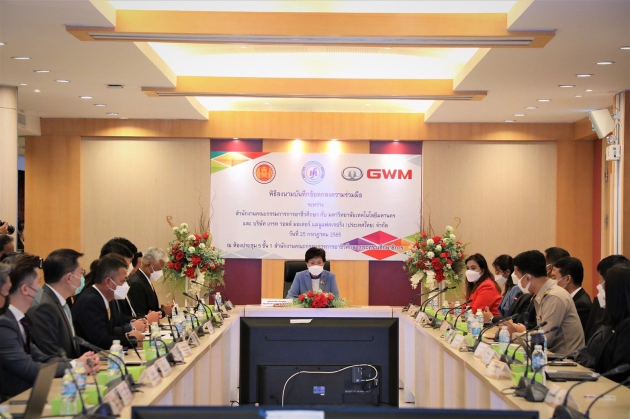 ดร.สุเทพ แก่งสันเทียะ เลขาธิการคณะกรรมการการอาชีวศึกษา กล่าวว่า ความร่วมมือระหว่างสำนักงานคณะกรรมการการอาชีวศึกษา (สอศ.) มหาวิทยาลัยเทคโนโลยีมหานคร และ เกรท วอลล์ มอเตอร์ ในครั้งนี้ จะเป็นประโยชน์ต่อการพัฒนาทักษะทางวิชาชีพของนักเรียนระดับอาชีวศึกษาในโครงการวิทยาลัยเทคโนโลยีฐานวิทยาศาสตร์ทั้ง 3 แห่งที่อยู่ภายใต้ความดูแลของ สอศ. พร้อมกับช่วยยกระดับการเรียนการสอนขึ้นไปอีกขั้นผ่านการฝึกฝนและสร้างเสริมประสบการณ์จริง เพื่อผลิตบุคลากรคุณภาพเข้าสู่ตลาดแรงงานสำหรับขับเคลื่อนอุตสาหกรรมใหม่ให้กับประเทศไทย โดย สอศ. จะช่วยประสานงานกับสถานศึกษาที่เกี่ยวข้อง พร้อมทั้งให้คำแนะนำและข้อมูลสำหรับการพัฒนาต้นแบบชุดฝึกยานยนต์สมัยใหม่และการประยุกต์ดัดแปลงต้นกำลังและแหล่งพลังงานจากมอเตอร์และแบตเตอรี่จากยานยนต์ไฟฟ้า ตลอดจนร่วมติดตามประเมินผลและปรับปรุงการประสานงานความร่วมมือให้เป็นไปอย่างมีประสิทธิภาพ
