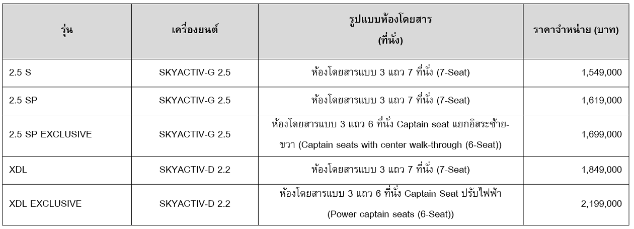 NEW MAZDA CX-8 มีให้เลือกทั้งหมด 5 รุ่นย่อย เพื่อให้ครอบคลุมความต้องการของกลุ่มลูกค้าทุกกลุ่มได้อย่างครบครัน โดยมีราคาจำหน่ายดังต่อไปนี้