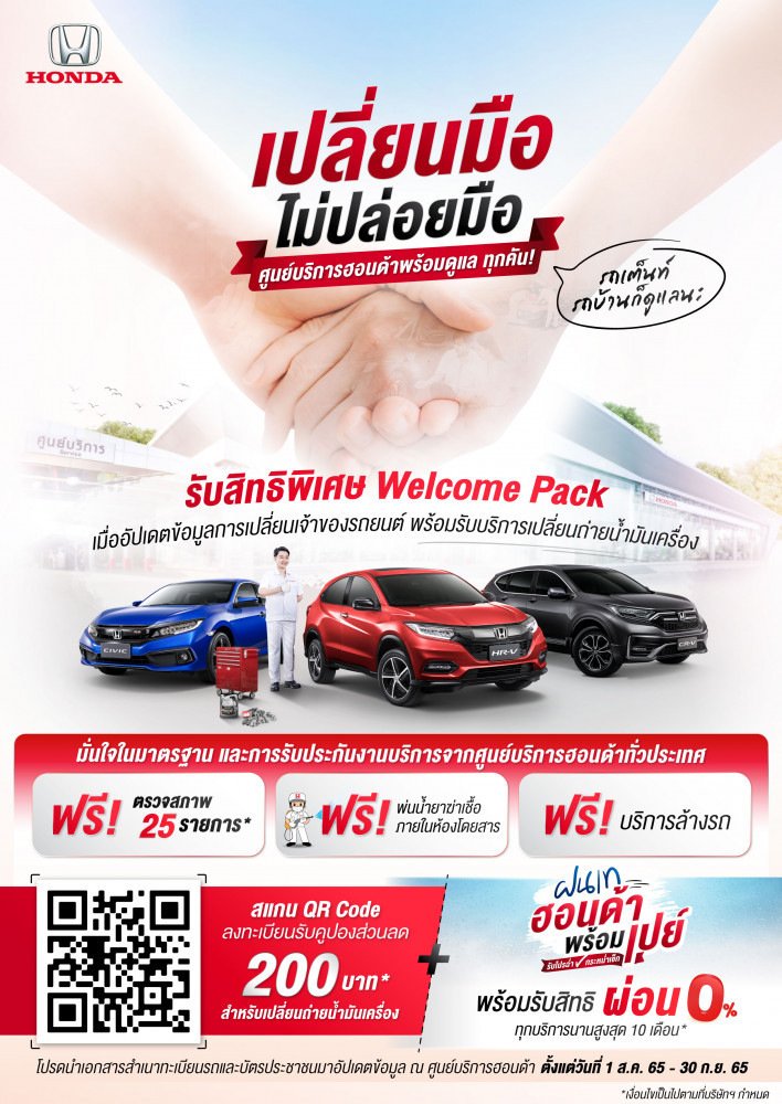 (กรุงเทพฯ – 8 สิงหาคม 2565) บริษัท ฮอนด้า ออโตโมบิล (ประเทศไทย) จำกัด ขอเชิญชวนลูกค้าเจ้าของรถยนต์ฮอนด้ามือสอง ทั้งกลุ่ม Honda Certified Used Car* และกลุ่มรถยนต์ฮอนด้ามือสองทั่วไป เพียงนำรถยนต์กลับเข้ารับบริการที่ศูนย์บริการฮอนด้าทั่วประเทศ พร้อมนำเอกสารหลักฐานการเปลี่ยนเจ้าของรถยนต์ (สำเนาทะเบียนรถและบัตรประชาชน) เพื่อปรับปรุงข้อมูลกับเจ้าหน้าที่ฮอนด้า ผ่านแคมเปญ “เปลี่ยนมือ ไม่ปล่อยมือ”** แคมเปญพิเศษเพื่อแทนคำขอบคุณลูกค้ารถยนต์ฮอนด้ามือสอง โดยมอบสิทธิประโยชน์พิเศษ “Welcome Pack” ฟรี 3 ต่อ ได้แก่ บริการตรวจเช็กสภาพรถยนต์ 25 รายการ โดยช่างผู้เชี่ยวชาญด้วยงานบริการที่ได้มาตรฐาน ฟรีบริการฉีดพ่นน้ำยาฆ่าเชื้อภายในห้องโดยสาร เพื่อเพิ่มความปลอดภัยในสถานการณ์โควิด-19 ฟรีบริการล้างรถและทำความสะอาดภายในรถ อีกทั้งรับส่วนลดพิเศษ 200 บาท สำหรับการเปลี่ยนถ่ายน้ำมันเครื่อง เมื่อลงทะเบียนรับสิทธิ์ผ่าน Line: @honda-thailand