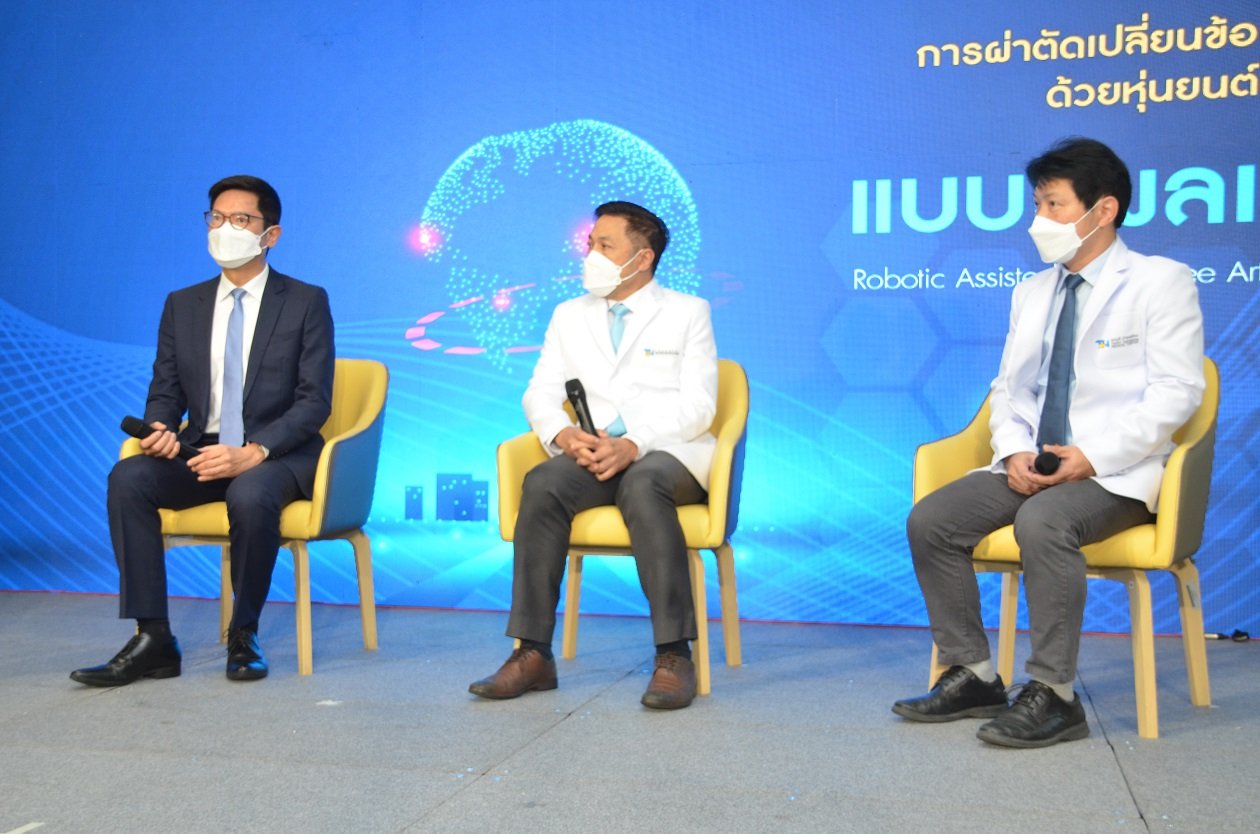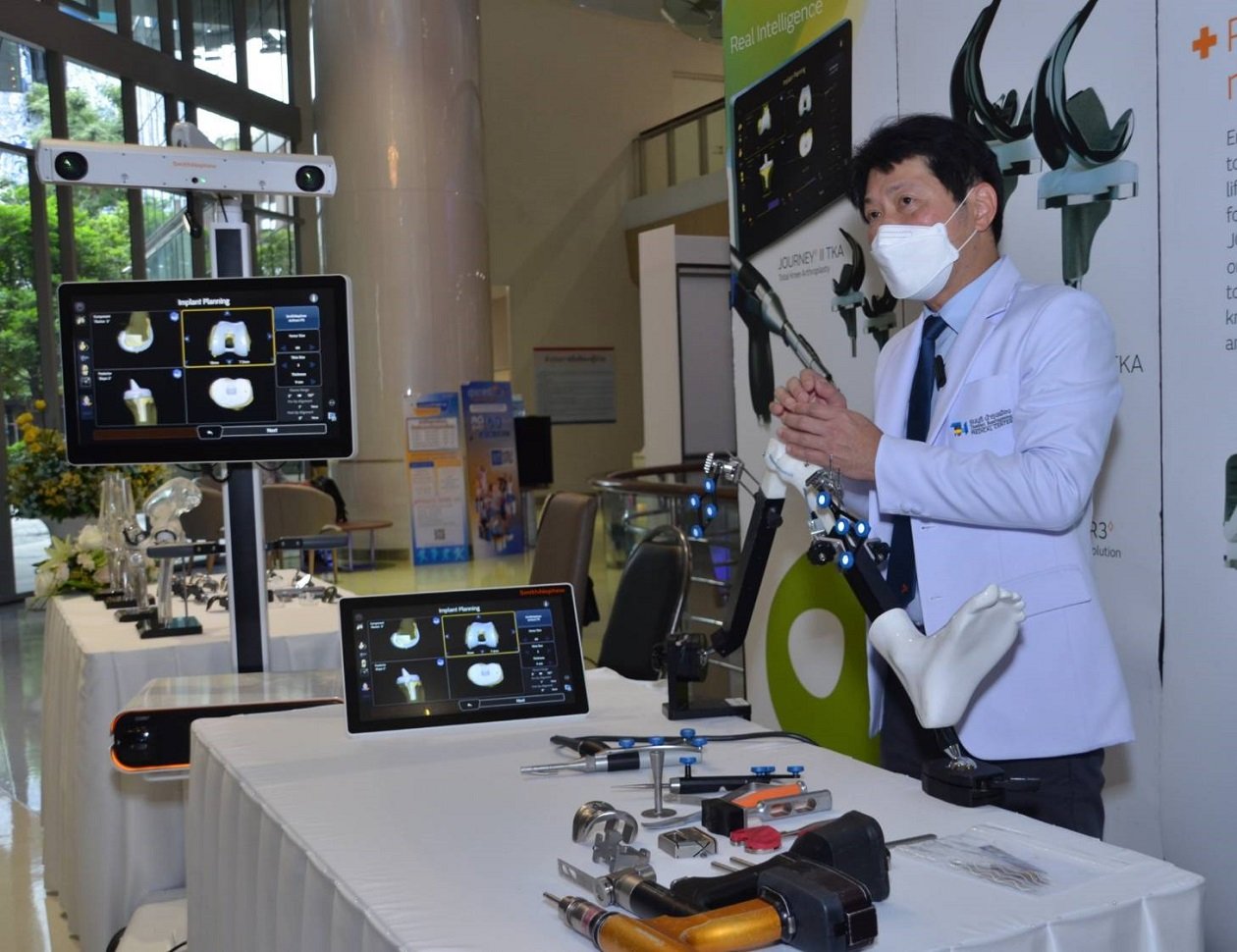 รศ.นพ.สาธิต เที่ยงวิทยาพร ประธานอนุสาขาข้อสะโพกข้อเข่าราชวิทยาลัยแพทย์ออร์โธปิดิกส์แห่งประเทศไทย ศัลยแพทย์ผู้เชี่ยวชาญในการผ่าตัดเปลี่ยนข้อเข่าเทียม หัวหน้าทีมแพทย์การผ่าตัดเปลี่ยนข้อเข่า ข้อสะโพก และแพทย์ที่ปรึกษาของศูนย์กระดูกและข้อ โรงพยาบาลธนบุรี บำรุงเมือง ซึ่งมีประสบการณ์ในการผ่าตัดด้วยเทคนิคการใช้หุ่นยนต์ผ่าตัด ไม่ต่ำกว่า 150 ราย ให้รายละเอียดเพิ่มเติมว่า การใช้เทคโนโลยีที่ไม่ต้องพึ่งการส่งผู้ป่วยตรวจ CT SCAN โดยใช้หุ่นยนต์ช่วยผ่าตัดเปลี่ยนข้อเข่าเทียมอัจฉริยะแบบแผลเล็ก Robotic Assisted Total Knee Arthroplasty ทำให้การผ่าตัดเปลี่ยนข้อเข่าเทียมเป็นไปได้อย่างถูกต้อง ตรงจุดมากขึ้น และยังช่วยศัลยแพทย์ผ่าตัด ในการคำนวณการปรับความตึงของเส้นเอ็นและกล้ามเนื้อโดยรอบข้อเข่าให้เป็นไปอย่างเหมาะสมโดยระบบปฏิบัติการของหุ่นยนต์ช่วยผ่าตัดจะประมวลผลข้อมูลที่ได้ออกมาเป็นรูปแบบจำลองของกระดูกคนไข้ซึ่งข้อมูลนี้เป็นข้อมูลเฉพาะบุคคลของคนไข้แต่ละราย