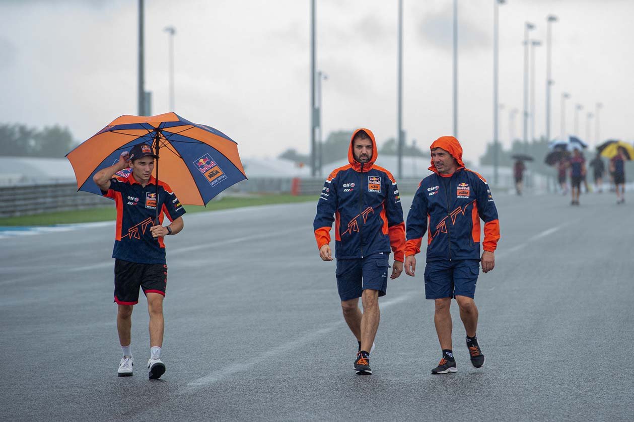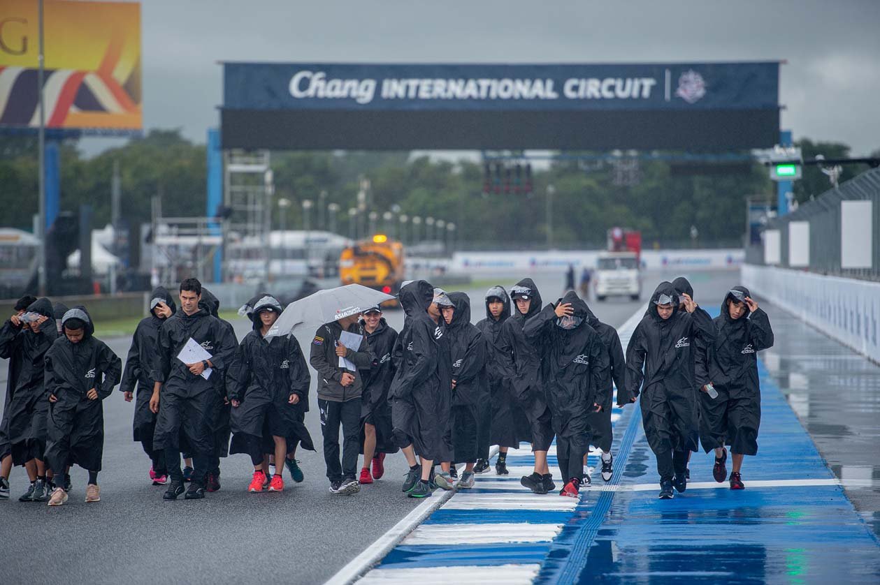 บรรยากาศโดยรวมมีฝนเทลงมาตลอดทั้งวันจากอิทธิพลของ “ไต้ฝุ่นโนรู” ซึ่งนักบิดระดับโลกร่วม 100 ชีวิต จากคลาสต่างๆได้แก่ โมโตจีพี, โมโตทู และ โมโตทรี ต่างก็ต้องทำการบ้านอย่างหนัก ด้วยการลงทำกิจกรรม Track Walk เดินสำรวจแทร็กของ สนามช้าง อินเตอร์เนชั่นแนล เซอร์กิต เพื่อเก็บข้อมูลสำหรับการแข่งขัน