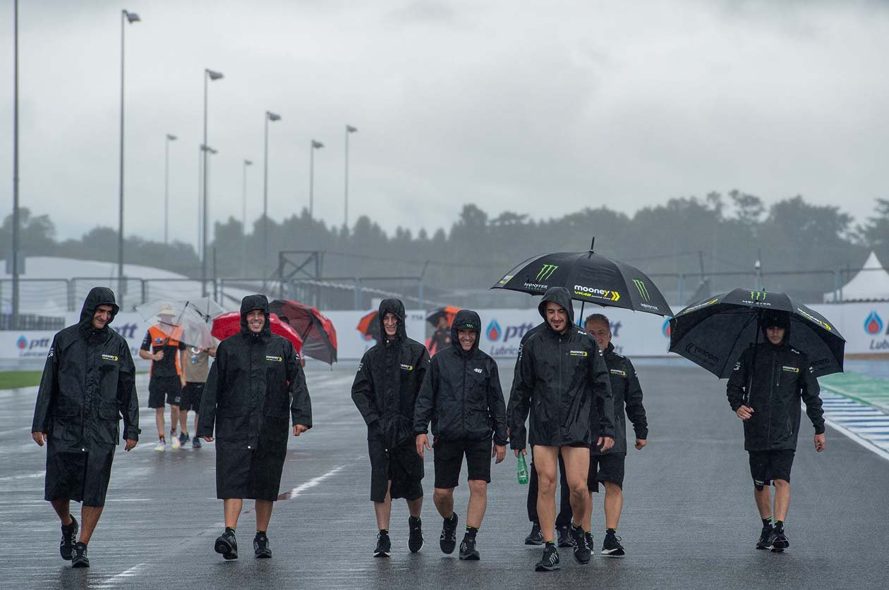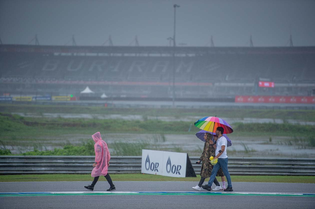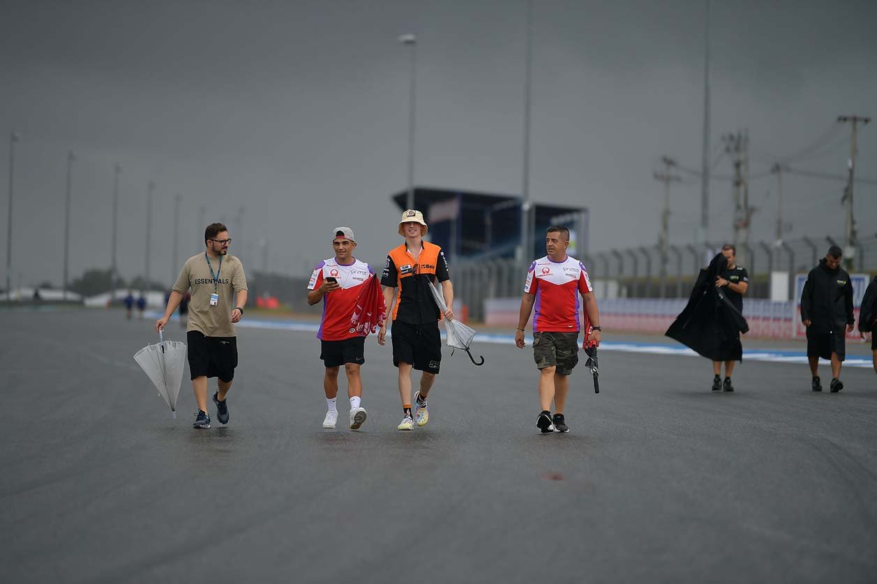 นักบิดดาวดังโมโตจีพีลงสำรวจแทร็กสนามช้าง เซอร์กิต ท่ามกลางสายฝนก่อนดวลเดือด “โออาร์ ไทยแลนด์ กรังด์ปรีซ์” สุดสัปดาห์นี้ ขณะตัวเต็งลุ้นแชมป์โลกมั่นใจ “ไต้ฝุ่นโนรู” ไม่กระทบการแข่งขัน ฟาบิโอ กวาร์ตาราโร แชมป์โลกชาวฝรั่งเศสจาก มอนสเตอร์ ยามาฮ่า เชื่อสร้างผลงานยอดเยี่ยมไม่ว่าฝนจะตกหรือไม่ ขณะ มาร์ค มาร์เกซ แชมป์เก่า 2 สมัยที่เมืองไทยหวังเกาะกลุ่มหน้า อ้อนแฟนชาวไทยอยากเจอเร็วๆ ด้านดอร์น่าสปอร์ตและฝ่ายยจัดผนึกกำลังเดินหน้าฝ่าพายุฝนจัดเตรียมงานกันอย่างหนัก เพื่อบิ๊กอีเว้นต์มอเตอร์สปอร์ตเบอร์หนึ่งของโลกที่ทุกคนรอคอยมากว่า 2 ปี กำลังจะระเบิดศึกขึ้นอยางยิ่งใหญ่
