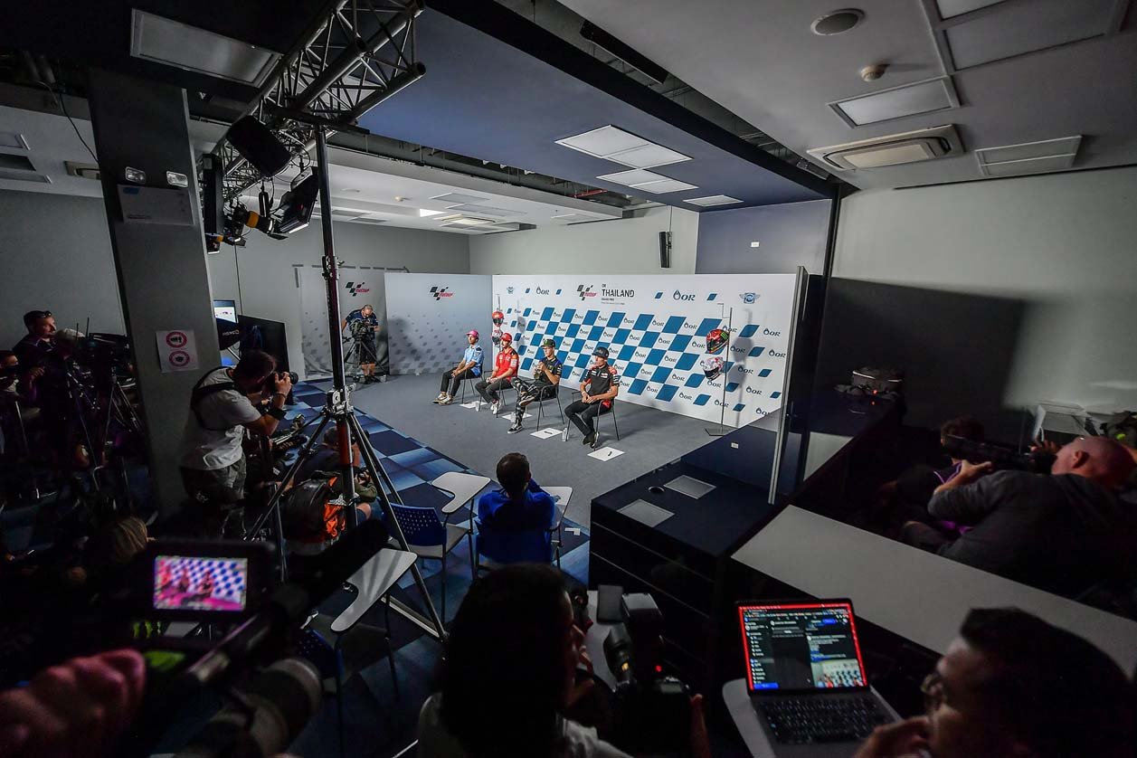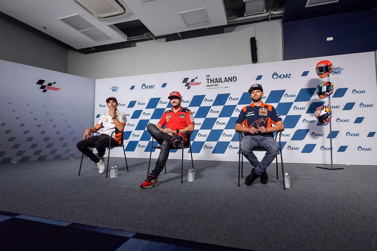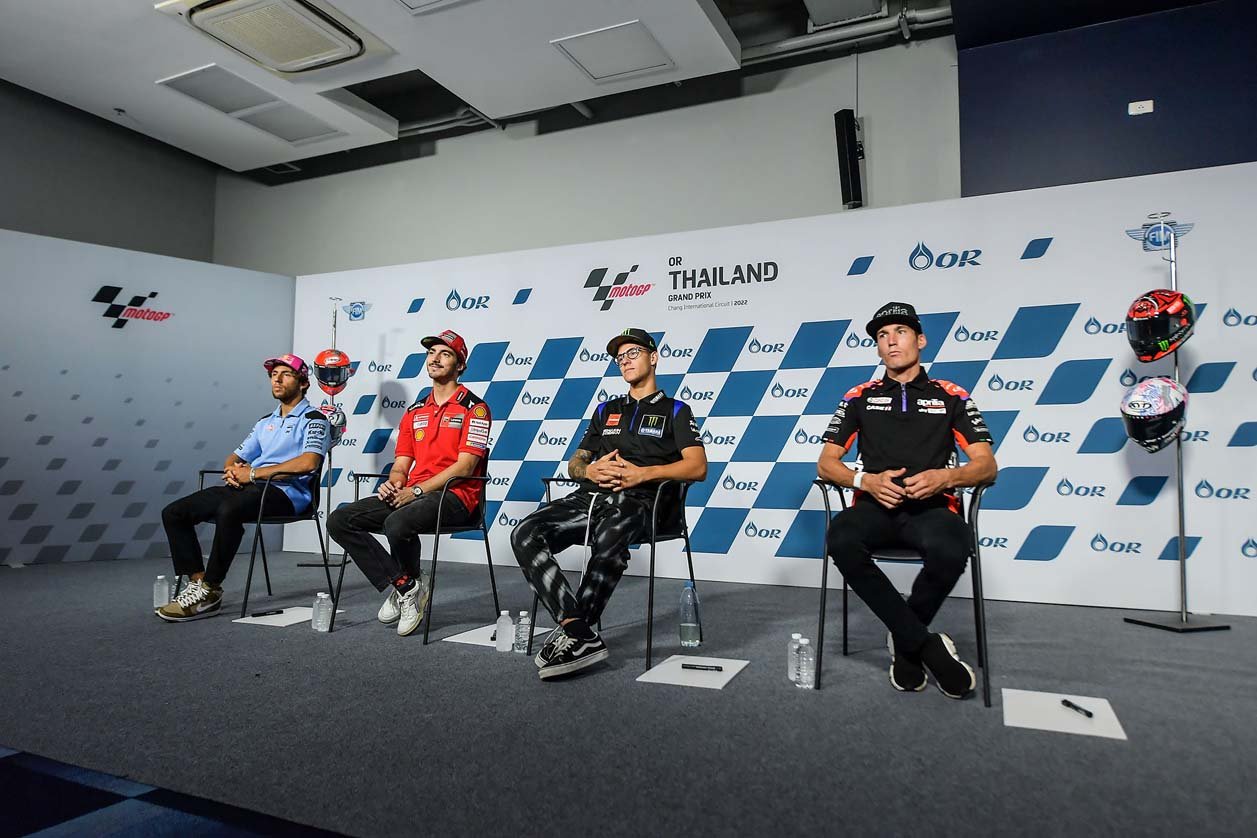 ขณะเดียวกันก็มีงานแถลงข่าวการเข้าสู่ โออาร์ ไทยแลนด์ กรังด์ปรีซ์ โดยมี 4 นักบิดที่ลุ้นแชมป์โลก โมโตจีพี 2022 ให้สัมภาษณ์กับสื่อมวลชนนำโดย ฟาบิโอ กวาร์ตาราโร แชมป์โลกชาวฝรั่งเศสจาก มอนสเตอร์ ยามาฮ่า, ฟรานเชสโก้ บันยาญ่า ผู้ท้าชิงชาวอิตาเลียนจาก ดูคาติ เลโนโว ทีม, อเลช เอสปาร์กาโร นักบิดสแปนิชจาก อพริเลีย เรซซิ่ง และ เอเนีย บาสเตียนินี นักบิดอิตาเลียนจาก เกรซินี เรซซิ่ง โดยทั้งหมดไม่มีความกังวลกับสภาพอากาศ และเชื่อว่าเรซจะสามารถดำเนินไปได้อย่างราบรื่น