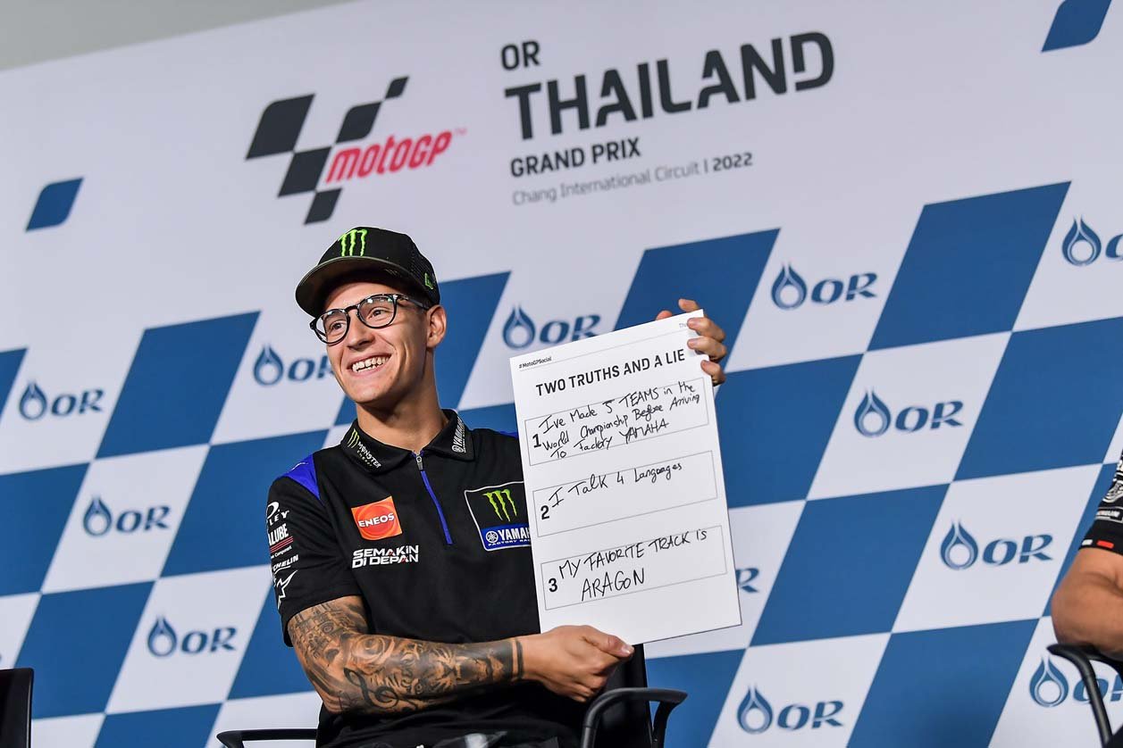 กวาร์ตาราโร จ่าฝูงบนตารางคะแนนสะสมกล่าวว่า “ผมไม่กังวลกับสภาพอากาศเลยครับ ไม่ว่าจะแทร็ก แห้ง หรือ เปียก ผมคิดว่าเราจะทำผลงานได้ดี มีเพียงเซ็คเตอร์ 1 และ 2 ที่ผมน่าจะมีปัญหา ผมมีความสุขมากที่เรากำลังจะได้ลงบิดที่ บุรีรัมย์ เป็นสนามต่อไป เพราะเป็นสนามที่ค่อนข้างดีกับผมและ ยามาฮ่า ด้วย ผมคว้าอันดับ 2 ใน ไทยแลนด์ กรังด์ปรีซ์ ครั้งที่แล้วเมื่อปี 2019 แน่นอนว่าผมจะทุ่มเทสุดความสามารถ เพื่อกลับไปยืนบนโพเดี้ยมให้ได้อีกครั้งในสนามนี้”