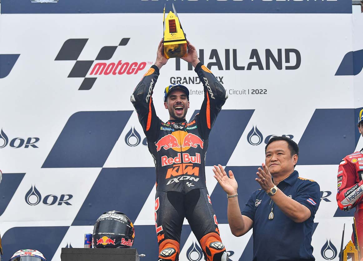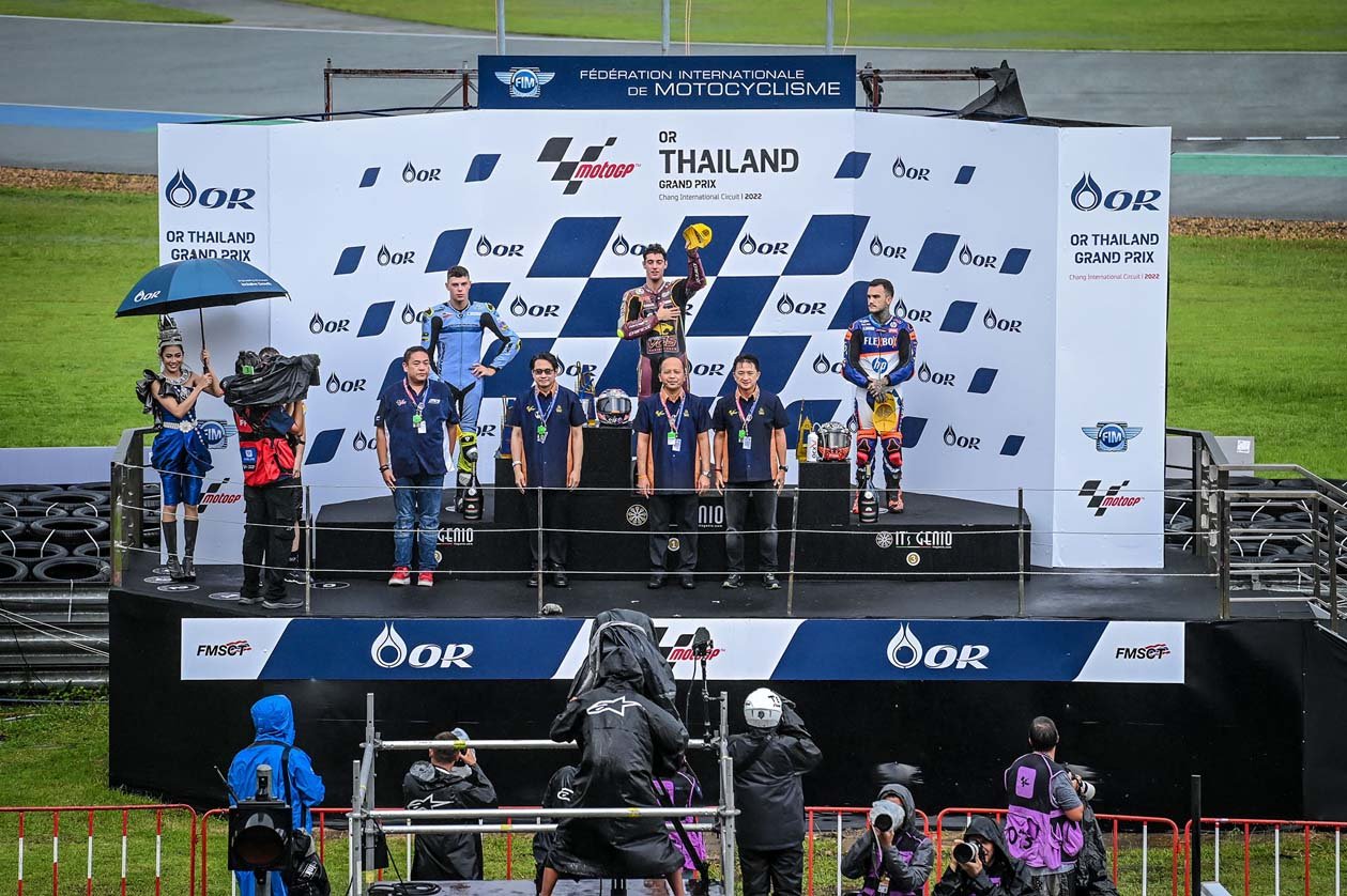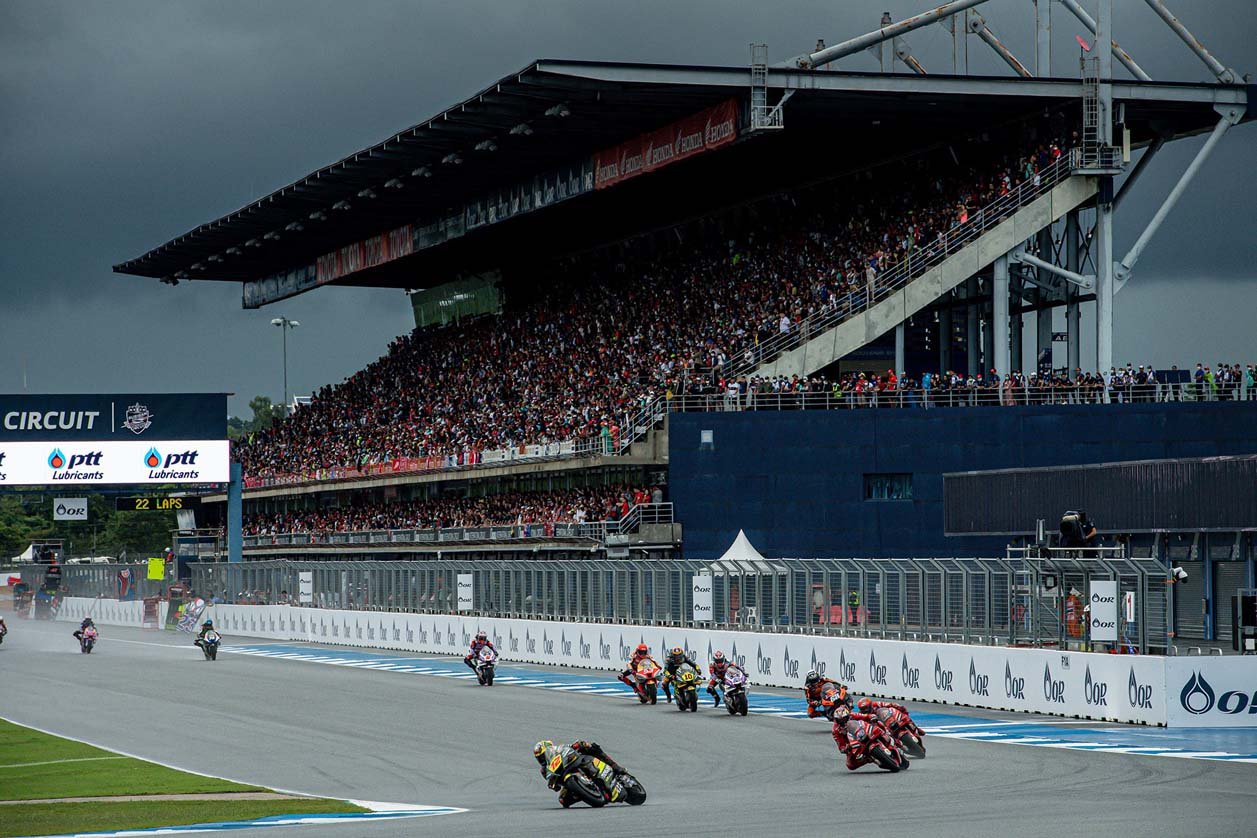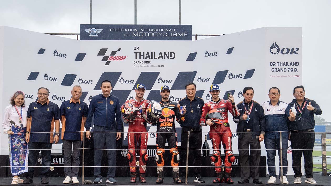 ศึกจักรยานยนต์ทางเรียบรายการใหญ่ที่สุดของโลก โมโตจีพี 2022 สนาม 17 รายการ โออาร์ ไทยแลนด์ กรังด์ปรีซ์ ปิดฉากลงอย่างยิ่งใหญ่ประทับใจแฟนๆ ทั่วโลก ผู้ชมทะลักสู่สนามถึง 178,463 คน อัดแน่นทุกสแตนด์ ภายใต้การลุ้นแชมป์สุดเข้มข้น เกมรุ่นใหญ่ “มิเกล โอลิเวียร่า” นักบิดโปรตุกีสจาก เรดบูล เคทีเอ็ม แฟ็คตอรี หักปากกาเซียนฝ่าฝนผงาดเป็นผู้ชนะคนใหม่ ส่วน“ก้อง” สมเกียรติ จันทรา นักบิดไทยจาก อิเดมิตสึ ฮอนด้า ทีม เอเชีย ขึ้นนำก่อนพลาดล้มดับฝันแฟนชาวไทย ขณะ “เคเคซัง” เขมินท์ คูโบะ จาก ยามาฮ่า วีอาร์46 มาสเตอร์ แคมป์ ระเบิดฟอร์มคว้าท็อป 9 ในรุ่น โมโตทู